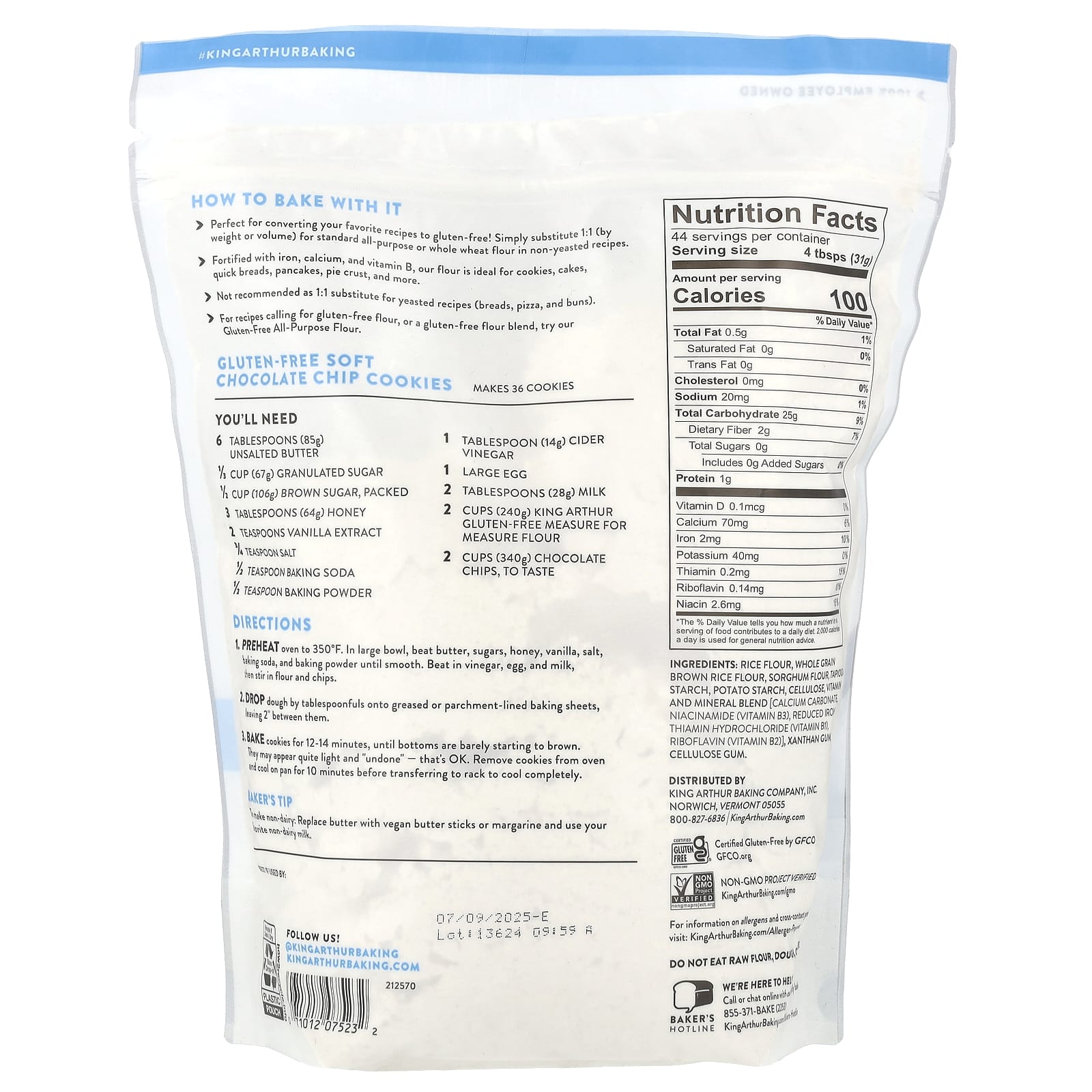 Рисовая мука, цельнозерновая мука из коричневого риса, мука из сорго, тапиоковый крахмал, картофельный крахмал, целлюлоза, смесь витаминов и минералов [карбонат кальция, ниацинамид (витамин B3), восстановленное железо, тиамина гидрохлорид (витамин B1), рибофлавин (витамин B2)], ксантановая камедь, целлюлозная камедь.