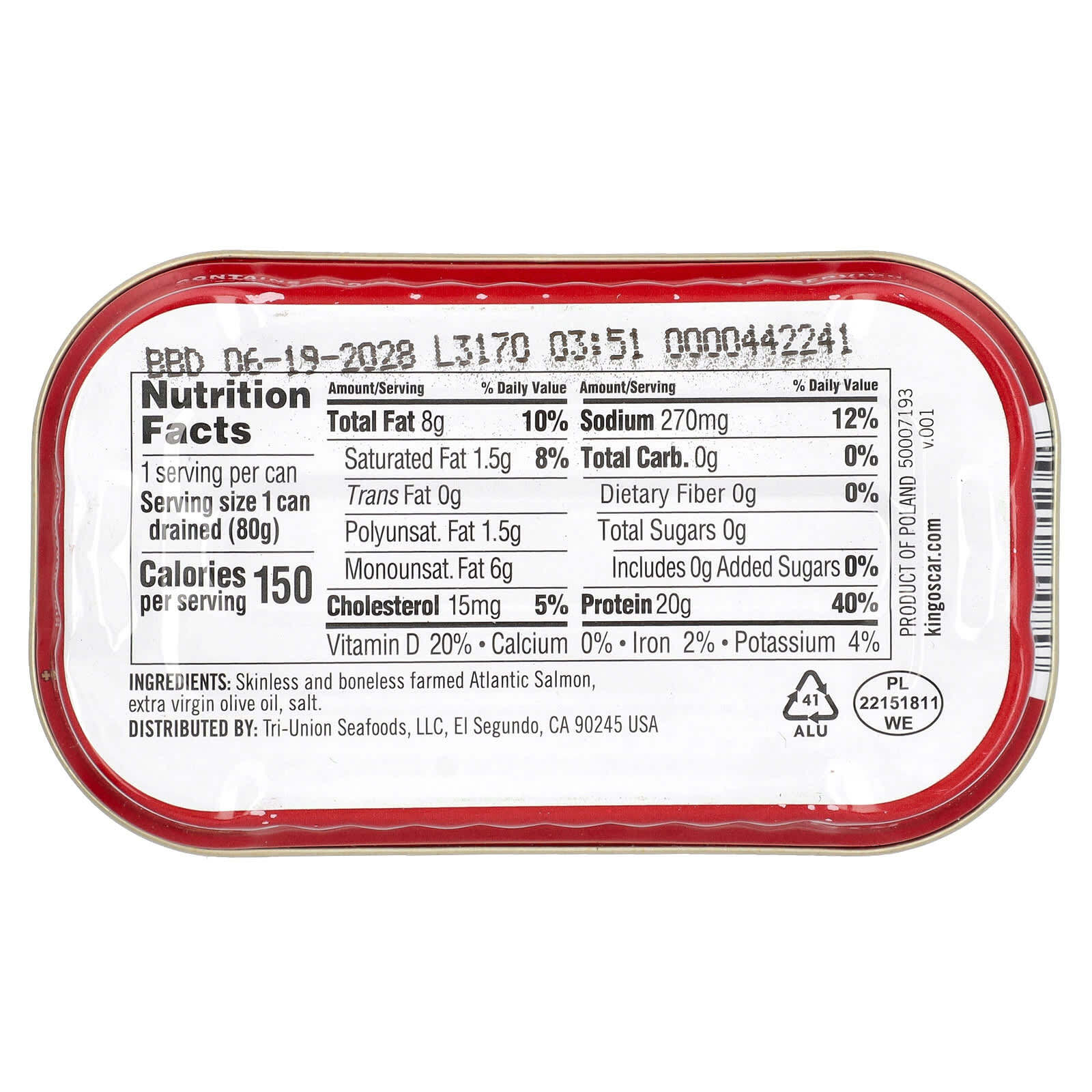 Индийский атлантический лосось высшего качества в нерафинированном оливковом масле высшего качества! Отборные кусочки изысканного качества атлантического лосося без кожи и костей, выращенные экологичным способом на фермах в Норвегии и упакованные вручную в сертифицированное 100% нерафинированное оливковое масло высшего качества. Всего три простых ингредиента. Невероятный, мягкий вкус и сочная текстура от King Oscar.