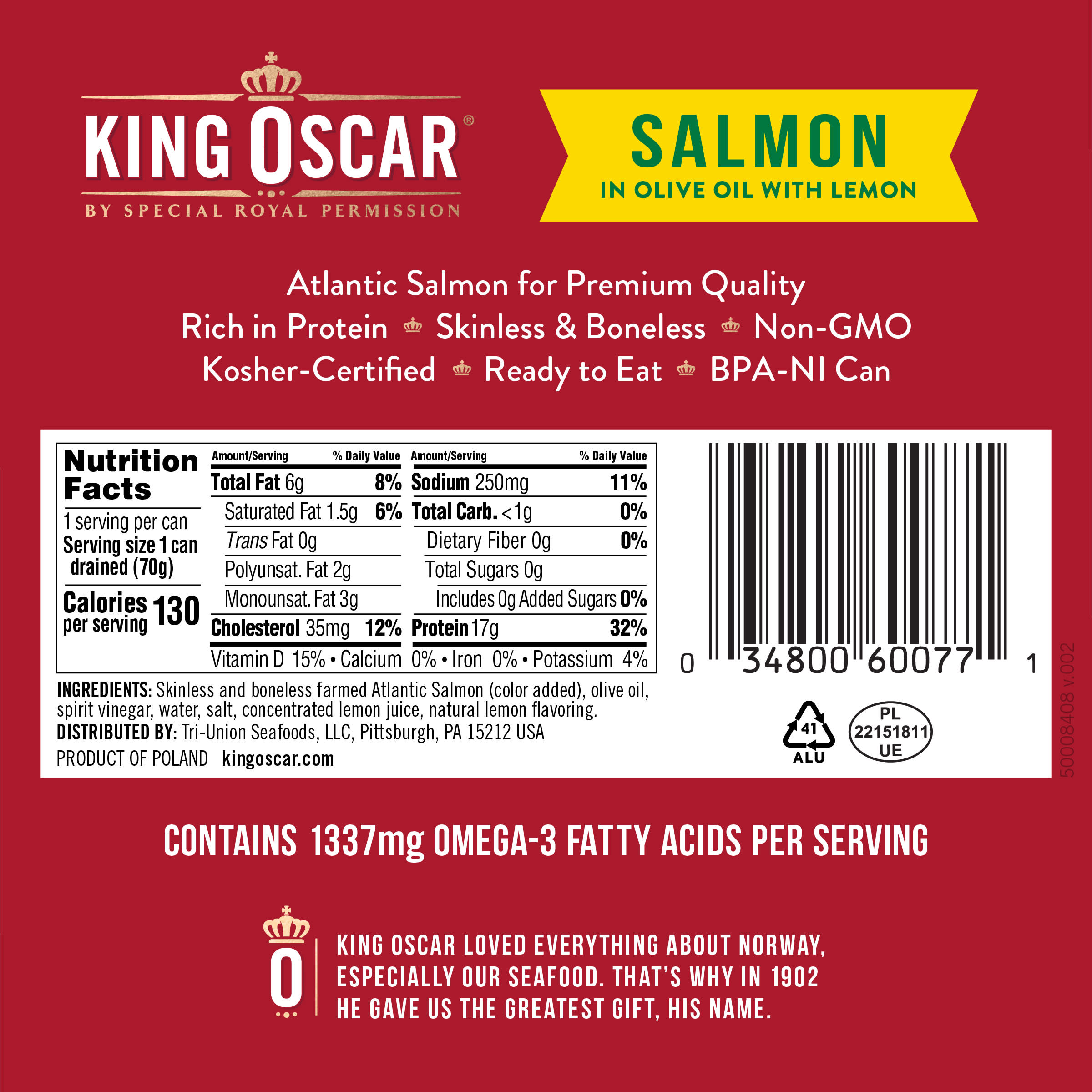 атлантический лосось без кожи и костей (с добавлением красителя), оливковое масло, спиртовой уксус, Вода, соль, концентрат лимонного сока, натуральный ароматизатор "Лимон".