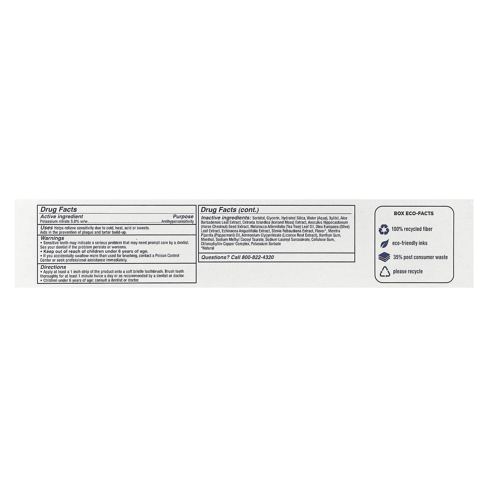 Эта успокаивающая зубная паста уменьшите чувствительность зубов и десен и подарите Breath Blasting Freshness™! Этот гель без фторида является мягким, но эффективным десенсибилизатором зубов — нитратом калия. Он помогает уменьшить и облегчить боль и дискомфорт у людей с чувствительностью зубов. В сочетании с успокаивающей смесью эхинацеи, алоэ и масла чайного дерева она помогает уменьшить скопление зубного налета и зубного камня. Почувствуйте облегчение от чистоты во рту с освежающим вкусом цитрусовых и мяты.