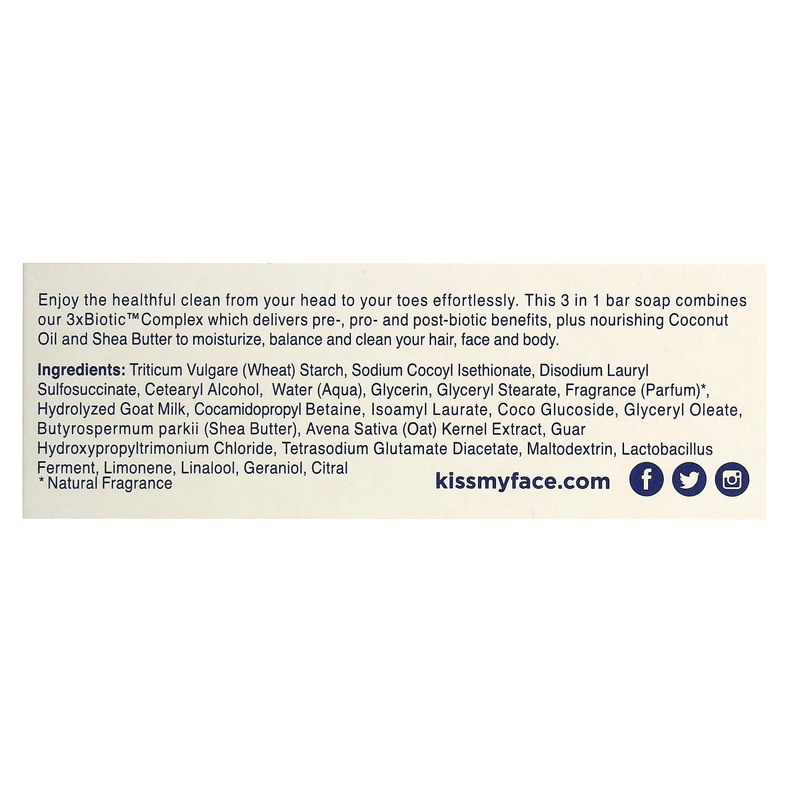 Наслаждайтесь здоровой чистотой с головы до ног. Это кусковое мыло 3 в 1 сочетает в себе комплекс 3xBiotic™, который обеспечивает пре-, пробиотики и постбиотики, а также питательные кокосовое масло и масло ши для увлажнения, восстановления баланса и очищения волос, лица и тела.