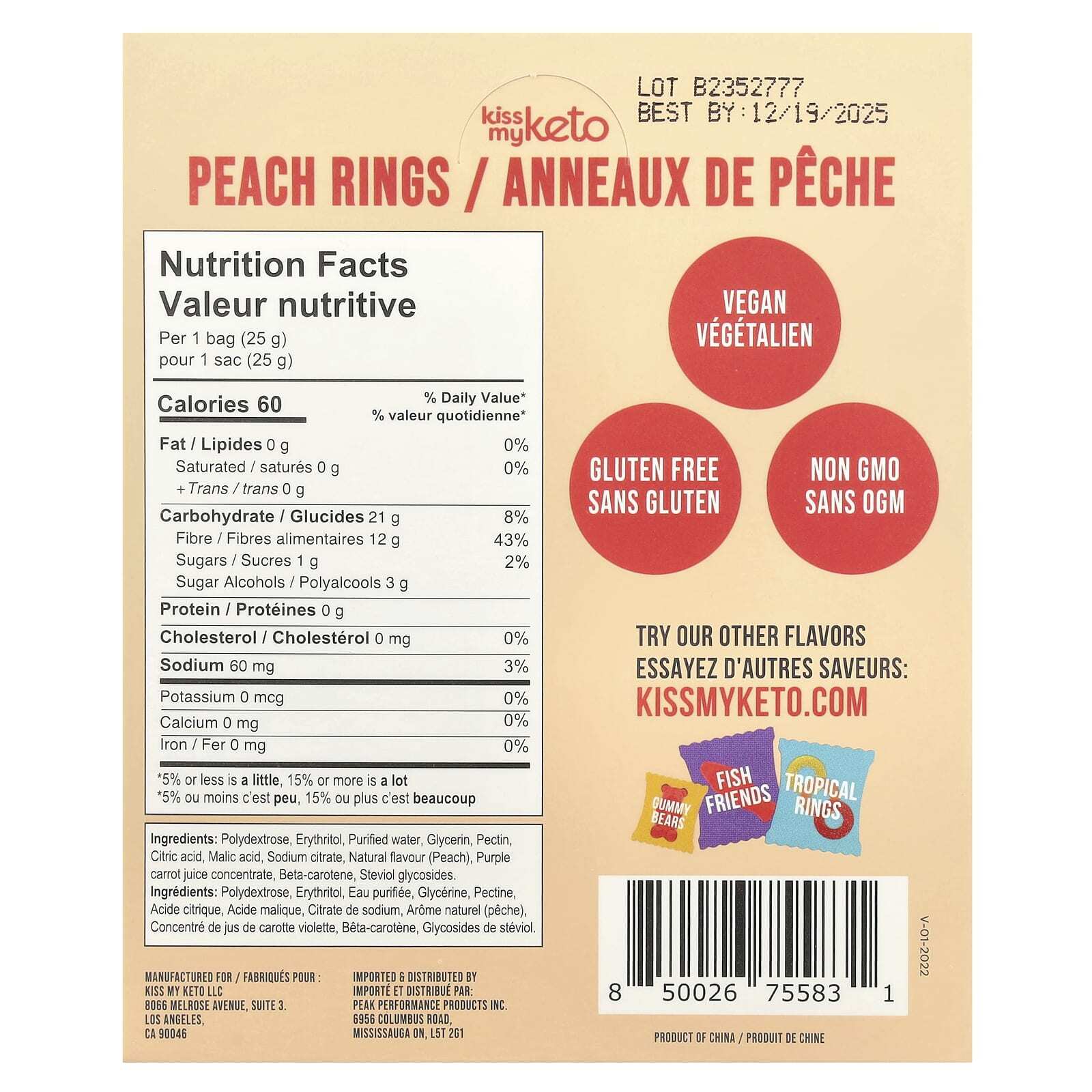Полидекстроза, эритритол, очищенная вода, глицерин, пектин, лимонная кислота, яблочная кислота, цитрат натрия, натуральный ароматизатор (персик), концентрат сока фиолетовой моркови, бета-каротин, стевиоловые гликозиды.
