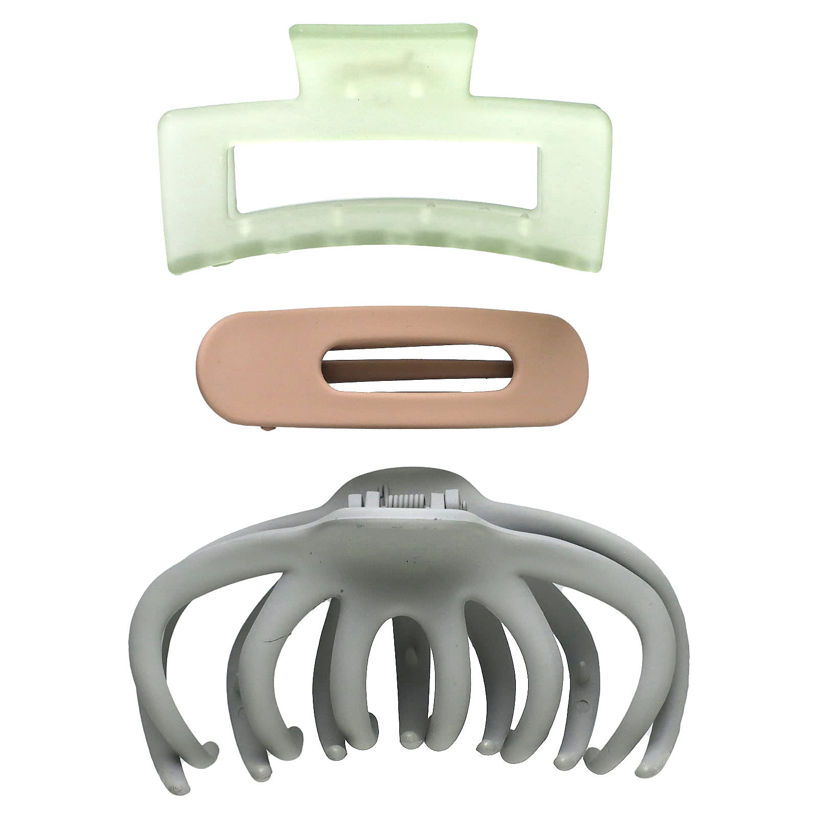 Большой зажим в виде осьминога для пучков и причесок, который остается на месте в течение всего дня, зажим в виде когтя средней открытой формы для легкого полного или наполовину приподнятого образа, а также плоский зажим в виде когтя для закрепления челки или создания свежих стилей.