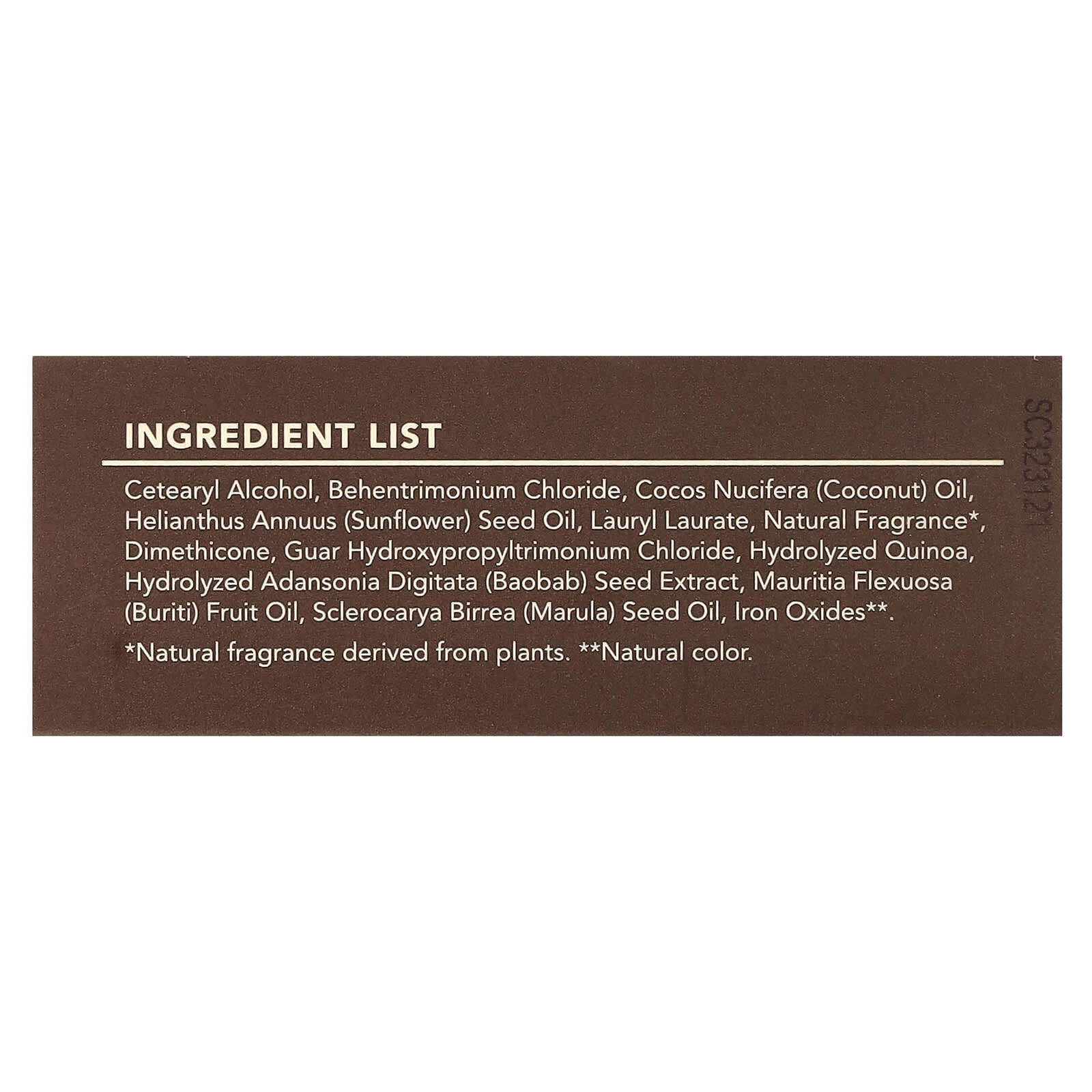 Цетеариловый спирт, бегентримония хлорид, кокосовое масло (Cocos nucifera), подсолнечное масло (Helianthus annuus), лаурил лаурат, натуральный аромат *, диметикон, гуар гидроксипропилтримония хлорид, гидролизованное киноа, гидролизованный экстракт семян баобаба (Adansonia digitata), масло плодов бурити (Mauritia flexuosa), масло семян марулы (Sclerocarya birrea), оксиды железа **.