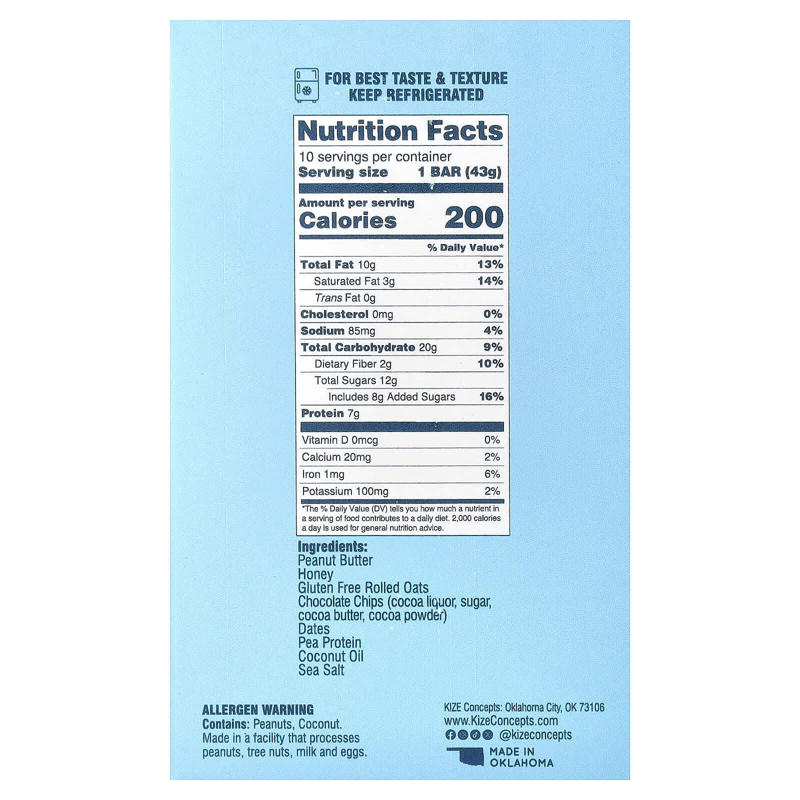 Арахисовая паста, мёд, овсяные хлопья без глютена, шоколадная крошка (тертое какао, сахар, какао-масло, какао-порошок), финики, гороховый протеин, кокосовое масло, морская соль.
