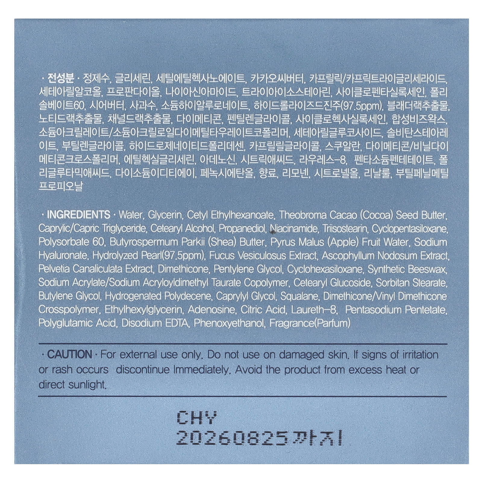 Вода, глицерин, цетилэтилгексаноат, масло из зерен какао (Theobroma cacao), каприловый/каприновый триглицерид, цетеариловый спирт, пропандиол, никотинамид, триизостеарин, циклопентасилоксан, полисорбат 60, масло ши (Butyrospermum parkii), соковая вода из яблок (Pyrus malus), гиалуронат натрия, гидролизованная жемчужина (97,5 част./млн), экстракт фукуса (Fucus vesiculosus), экстракт аскофиллума (Ascophyllum nodosum), экстракт апельсина (Pelvetia canaliculate), диметикон, пентилен гликоль, циклогексасилоксан, синтетический воск, натрий акрилат/натрий акрилоилдиметилтаурат сополимер, цетеариловый глюкозид, сорбитан стеарат бутиленгликоль, гидрогенизированный полидецен, каприлилгликоль, сквалан, диметикон/винил диметикон кроссполимер, этилгексилглицерин, аденозин, лимонная кислота, лаурет-8, пентанатрия пентетат, полиглутаминовая кислота, двунатриевая ЭДТК, феноксиэтанол, отдушка (парфюмерная композиция).