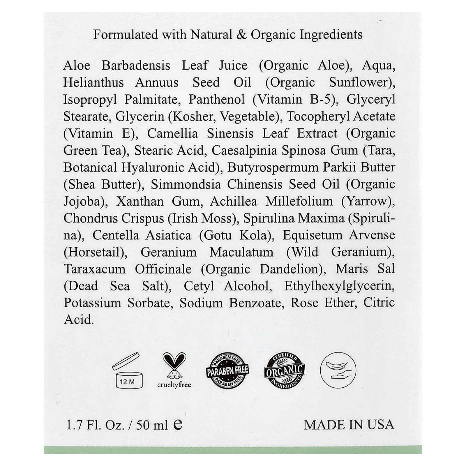 Сок листьев алоэ вера (Aloe barbadensis), вода (Aqua), масло из семян подсолнечника (Helianthus annuus), изопропилпальмитат, пантенол (витамин B5), глицерил стеарат, глицерин (кошерный, овощной), токоферилацетат (витамин Е), экстракт листьев камелии китайской (органический зеленый чай), стеариновая кислота, камедь цезальпинии (Caesalpinia spinosa), растительная гиалуроновая кислота), масло ши (Butyrospermum parkii), масло семян органического жожоба (Simmondsia chinensis), ксантановая камедь, тысячелистник обыкновенный (Achillea millefolium), chondrus crispus (ирландский мох), спирулина максима (Spirulina), центелла азиатская (готу кола), хвощ полевой (Equisetum arvense), Geranium maculatum (дикая герань), taraxacum officinale (органический одуванчик), соль Мертвого моря (Maris sal), цетиловый спирт, этилгексилглицерин, сорбат калия, бензоат натрия, розовый эфир, лимонная кислота.