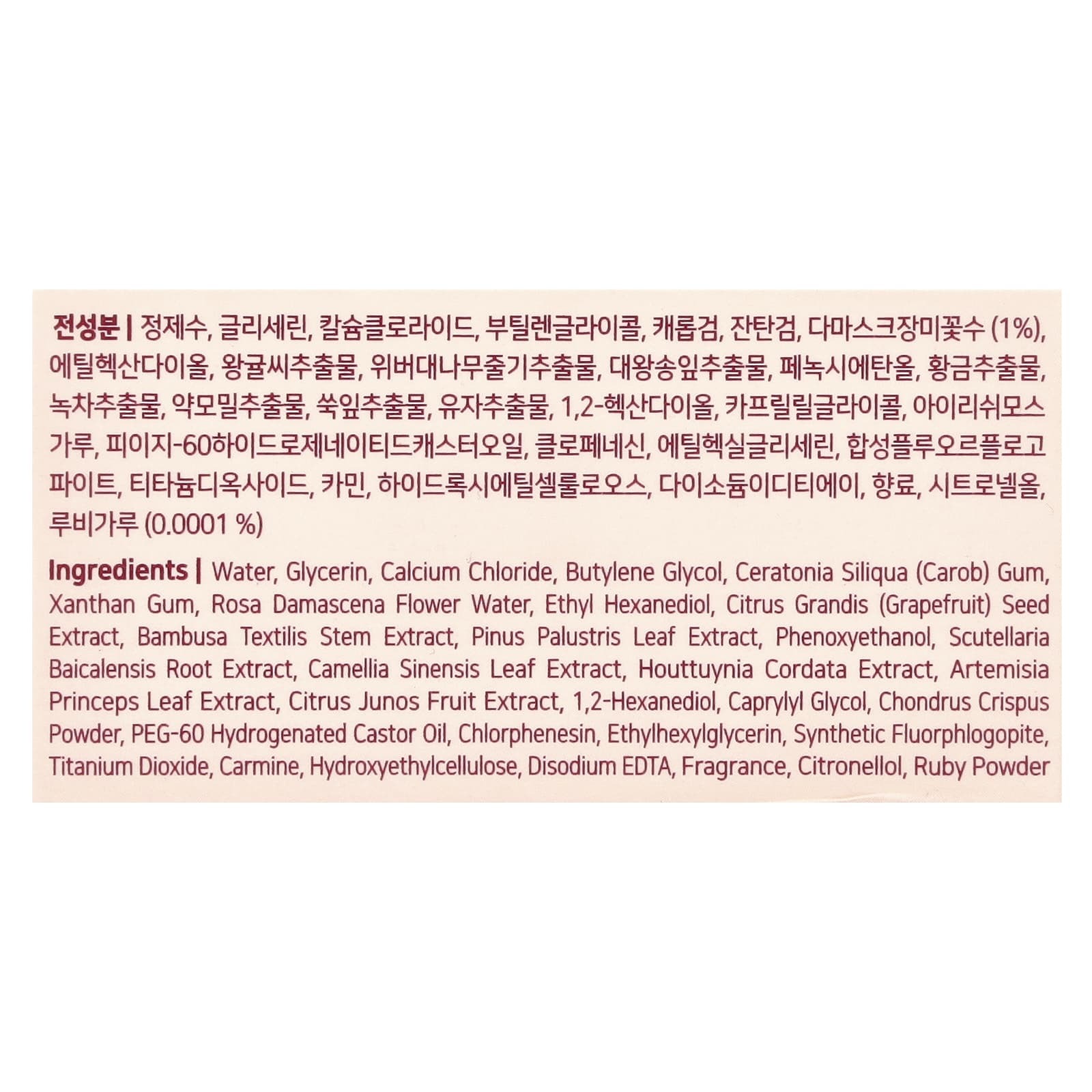 Вода, глицерин, хлорид кальция, бутиленгликоль, камедь цератонии, ксантановая камедь, каррагинан (Chondrus crispus), вода из цветов Rosa damascena (1%), гидроксиэтилцеллюлоза, гидрированное касторовое масло ПЭГ-60, спирт, синтетический фторфлогопит, диоксид титана, рубиновый порошок (0,0001%), динатриевая соль ЭДТА, экстракт корня Scutellaria baicalensis, экстракт листьев Camellia sinensis, экстракт Houttuynia cordata, экстракт Artemisa vulgaris, экстракт плодов Citrus junos, 1,2-гександиол, каприлилгликоль, этилгександиол, экстракт семян грейпфрута (Citrus grandis), экстракт стебля Bambusa textilis, экстракт листьев Pinus palustris, хлорфенезин, феноксиэтанол, метилпарабен, ароматизатор.