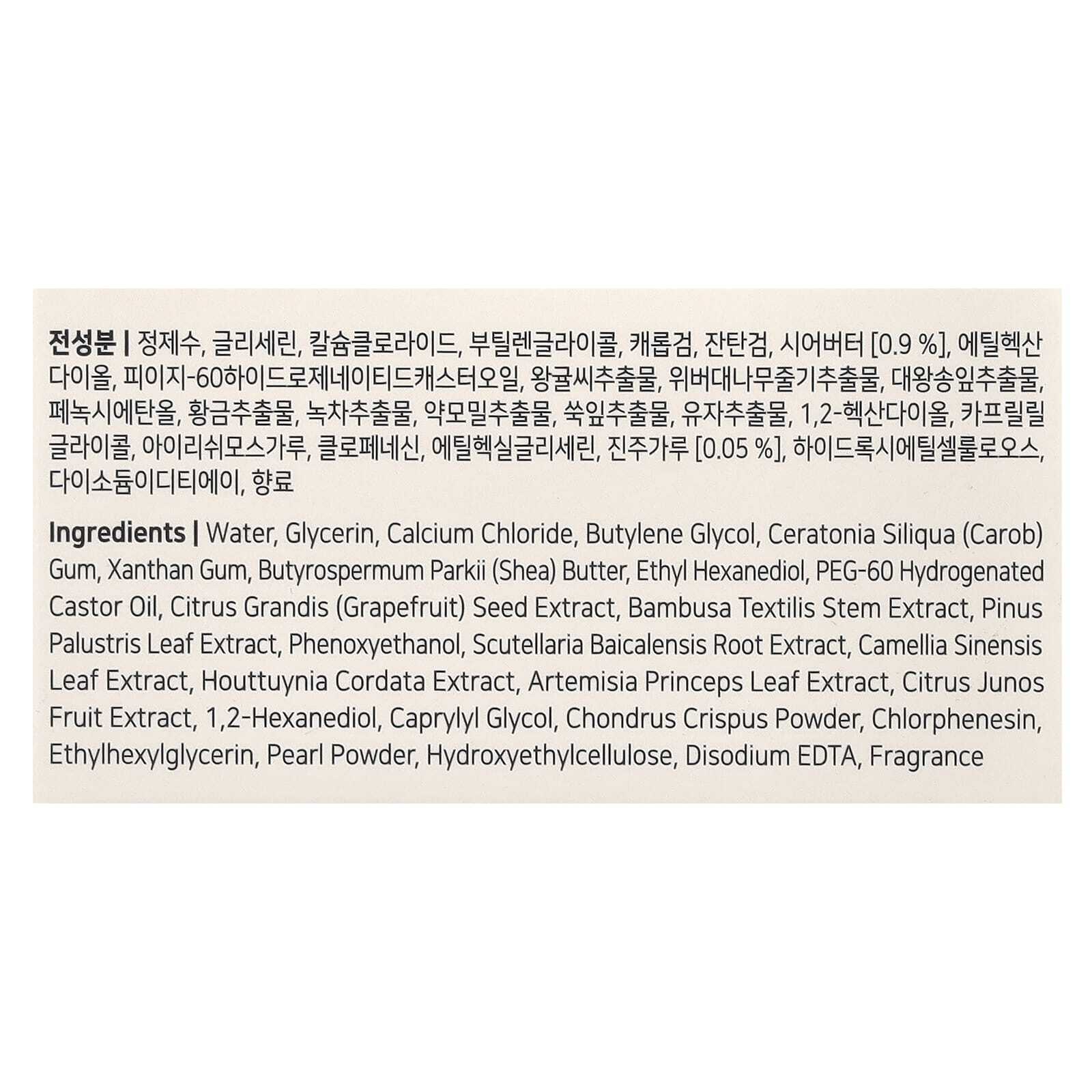 Вода, глицерин, хлорид кальция, бутиленгликоль, камедь цератонии, ксантановая камедь, каррагинан (Chondrus crispus), масло ши (Butyrospermum parkii, 1%), гидроксиэтилцеллюлоза, гидрированное касторовое масло ПЭГ-60, спирт, жемчужные белила (0,05%), динатриевая соль ЭДТА, экстракт корня Scutellaria baicalensis, экстракт листьев Camellia sinensis, экстракт Houttuynia cordata, экстракт Artemisa vulgaris, экстракт плодов Citrus junos, 1,2-гександиол, каприлил гликоль, этилгександиол, экстракт семян грейпфрута (Citrus grandis), экстракт стебля Bambusa textilis, экстракт из листьев Pinus palustris, хлорфенезин, феноксиэтанол, метилпарабен, ароматизатор.