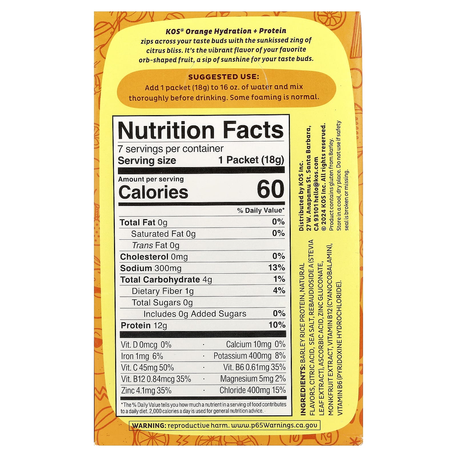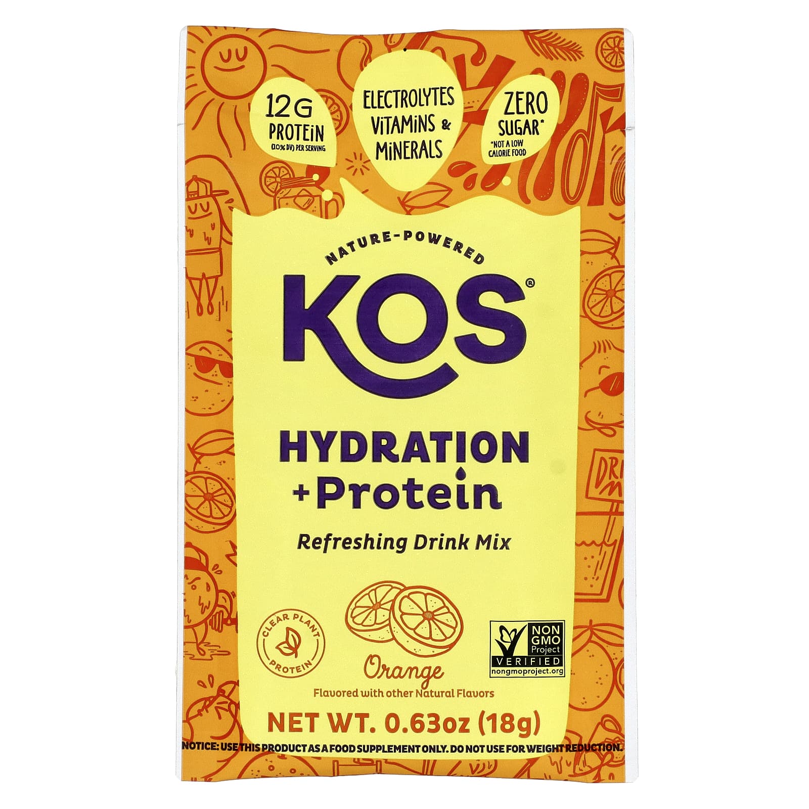 KOS, Hydration + Protein, освежающая смесь для напитков, апельсин, 7 пакетиков по 18 г (0,65 унции)