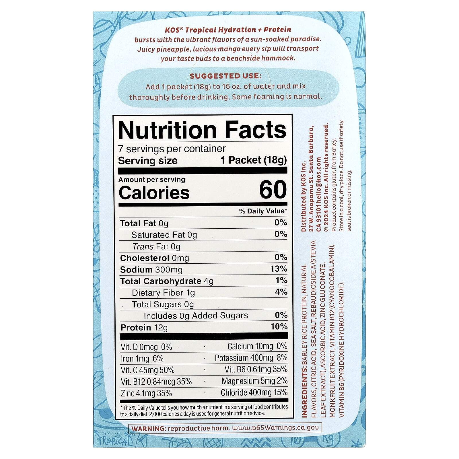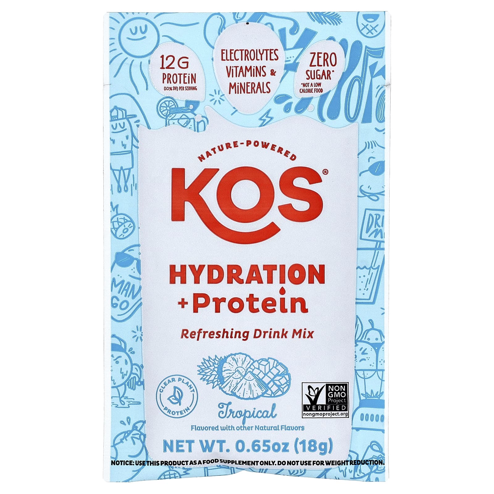 KOS® Tropical Hydration + Protein обладает ярким вкусом залитого солнцем рая. Сочный ананас, сочный манго, каждый глоток перенесет ваши вкусовые рецепторы в пляжный гамак.