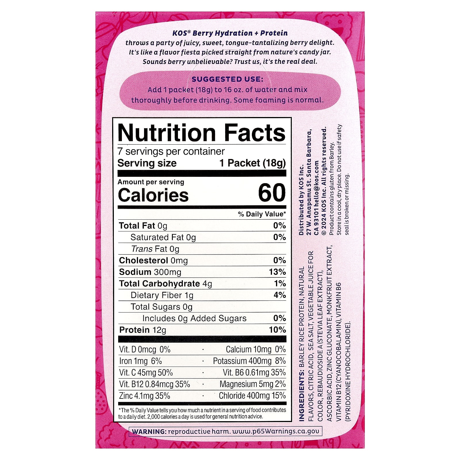 KOS, Hydration + Protein, освежающая смесь для напитков, ягоды, 7 пакетиков по 18 г (0,65 унции)