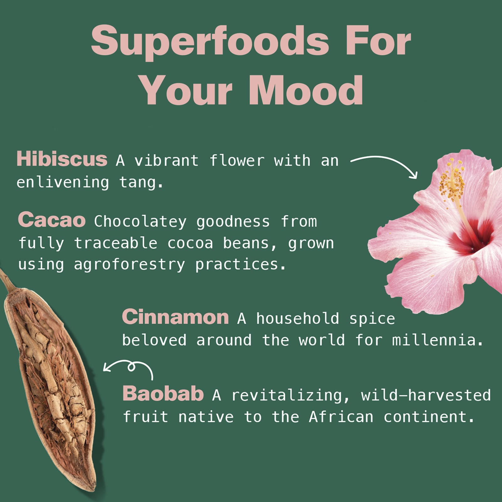 Порошок из органического баобаба, порошок из органического гибискуса, порошок из корня органической маки.