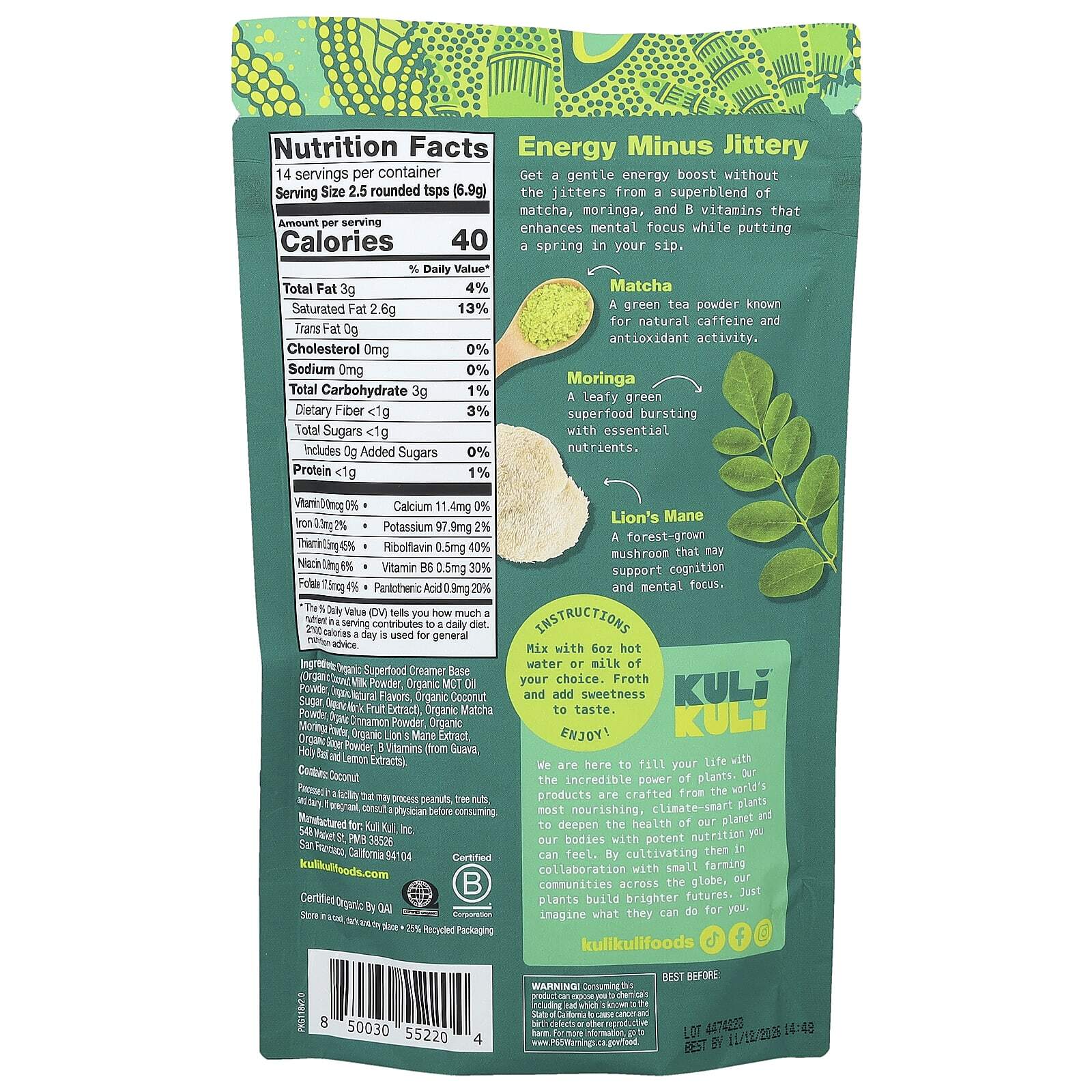 Органическая основа для сливок из суперфудов (органическое сухое кокосовое молоко, органический масляный порошок mct, органические натуральные ароматизаторы, органический кокосовый сахар, органический экстракт плодов монаха), органический порошок матча, органический порошок из корицы, органический порошок моринги, экстракт органического ежовика гребенчатого, органический имбирный порошок, витамины группы B (из гуавы, экстракты базилика и лимона).