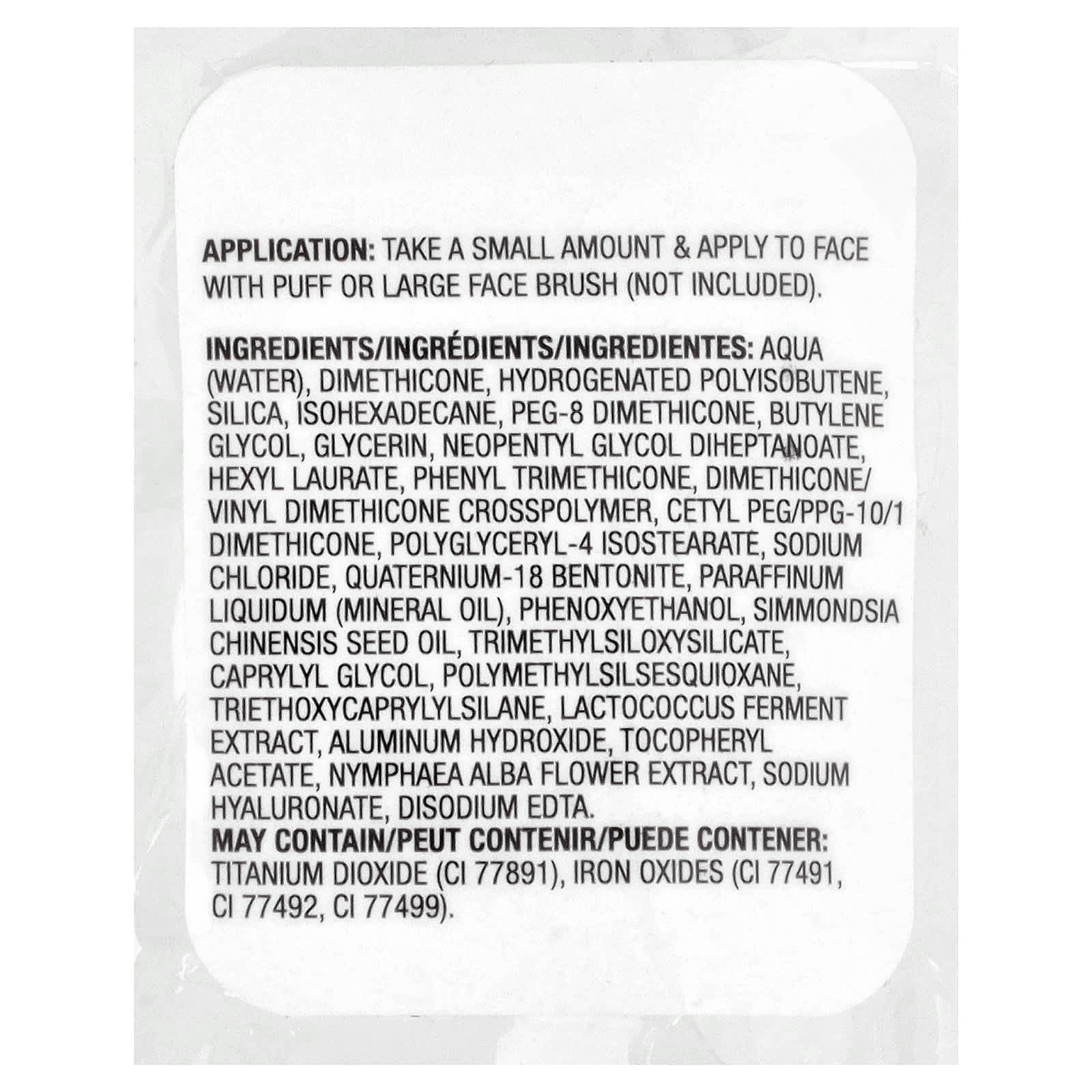 Вода (Aqua), диметикон, гидрогенизированный полиизобутен, диоксид кремния, изогексадекан, ПЭГ-8 диметикон, бутиленгликоль, глицерин, неопентилгликоль дигептаноат, гексил лаурат, фенилтриметикон, диметикон/винил диметикон кроссполимер, цетил ПЭГ/ППГ-10/1 диметикон, полиглицерил-4 изостеарат, хлорид натрия, кватерний-18 бентонит, вазелиновое (минеральное) масло, феноксиэтанол, масло семян жожоба (Simmondsia chinensis), триметилсилоксисиликат, каприлилгликоль, полиметилсилсесквиоксан, триэтоксикаприлилсилан, экстракт продукта ферментации лактококка, гидроксид алюминия, токоферилацетат, экстракт цветков кувшинки белой (Nymphaea alba), гиалуронат натрия, двунатриевая ЭДТК.