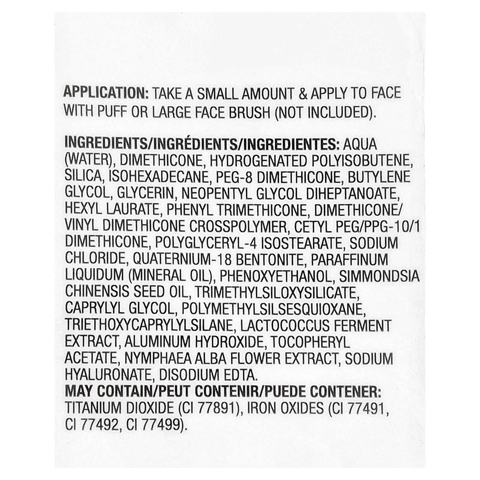 Вода, диметикон, гидрогенизированный полиизобутен, диоксид кремния, изогексадекан, ПЭГ-8 диметикон, бутиленгликоль, глицерин, неопентилгликоль дигептаноат, гексил лаурат, фенилтриметикон, диметикон/винил диметикон кроссполимер, цетил ПЭГ/ППГ-10/1 диметикон, полиглицерил-4 изостеарат, хлорид натрия, кватерний-18 бентонит, вазелиновое (минеральное) масло, феноксиэтанол, масло семян жожоба (Simmondsia chinensis), триметилсилоксисиликат, каприлилгликоль, полиметилсилсесквиоксан, триэтоксикаприлилсилан, экстракт продукта ферментации лактококка, гидроксид алюминия, токоферилацетат, экстракт цветков кувшинки белой (Nymphaea alba), гиалуронат натрия, двунатриевая ЭДТК.