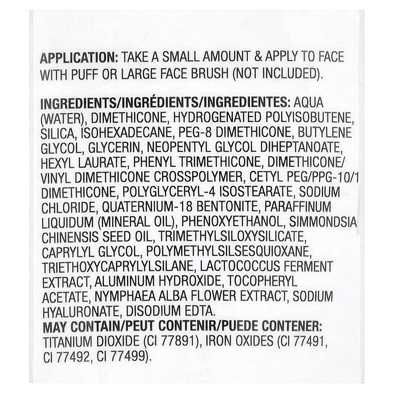 Вода, диметикон, гидрогенизированный полиизобутен, диоксид кремния, изогексадекан, ПЭГ-8 диметикон, бутиленгликоль, глицерин, неопентилгликоль дигептаноат, гексил лаурат, фенилтриметикон, диметикон/винил диметикон кроссполимер, цетил ПЭГ/ППГ-10/диметикон, полиглицерил-4 изостеарат, хлорид натрия, кватерний-18 бентонит, вазелиновое (минеральное) масло, феноксиэтанол, масло семян жожоба (Simmondsia chinensis), триметилсилоксисиликат, каприлилгликоль, полиметилсилсесквиоксан, триэтоксикаприлилсилан, экстракт продукта ферментации лактококка, гидроксид алюминия, токоферилацетат, экстракт цветков кувшинки белой (Nymphaea alba), гиалуронат натрия, двунатриевая ЭДТК.