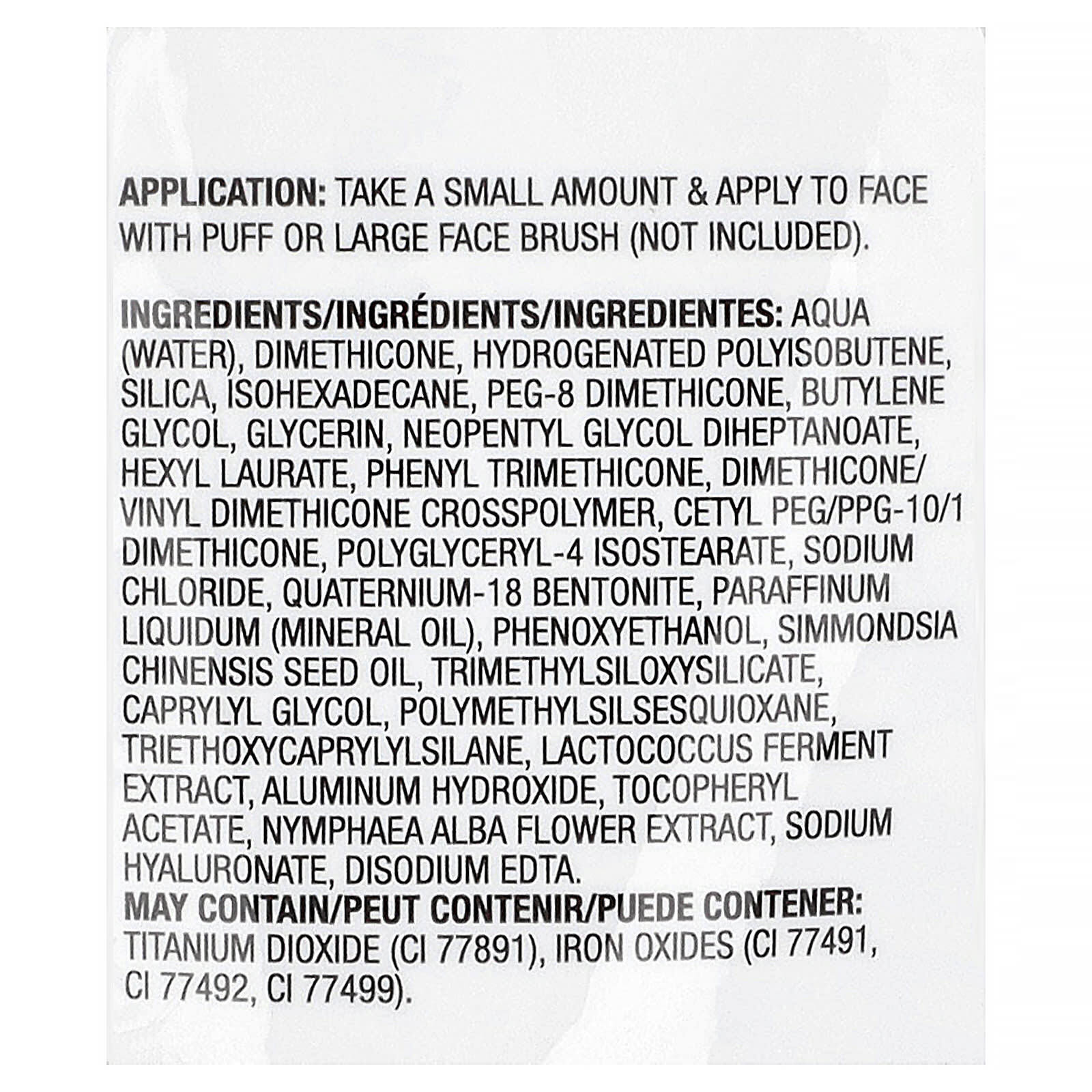 Вода, диметикон, гидрогенизированный полиизобутен, диоксид кремния, изогексадекан, ПЭГ-8 диметикон, бутиленгликоль, глицерин, неопентилгликоль дигептаноат, гексил лаурат, фенилтриметикон, диметикон/винил диметикон кроссполимер, цетил ПЭГ/ППГ-10/1 диметикон, полиглицерил-4 изостеарат, хлорид натрия, кватерний-18 бентонит, вазелиновое (минеральное) масло, феноксиэтанол, масло семян жожоба (Simmondsia chinensis), триметилсилоксисиликат, каприлилгликоль, полиметилсилсесквиоксан, триэтоксикаприлилсилан, экстракт продукта ферментации лактококка, гидроксид алюминия, токоферилацетат, экстракт цветков кувшинки белой (Nymphaea alba), гиалуронат натрия, двунатриевая ЭДТК.