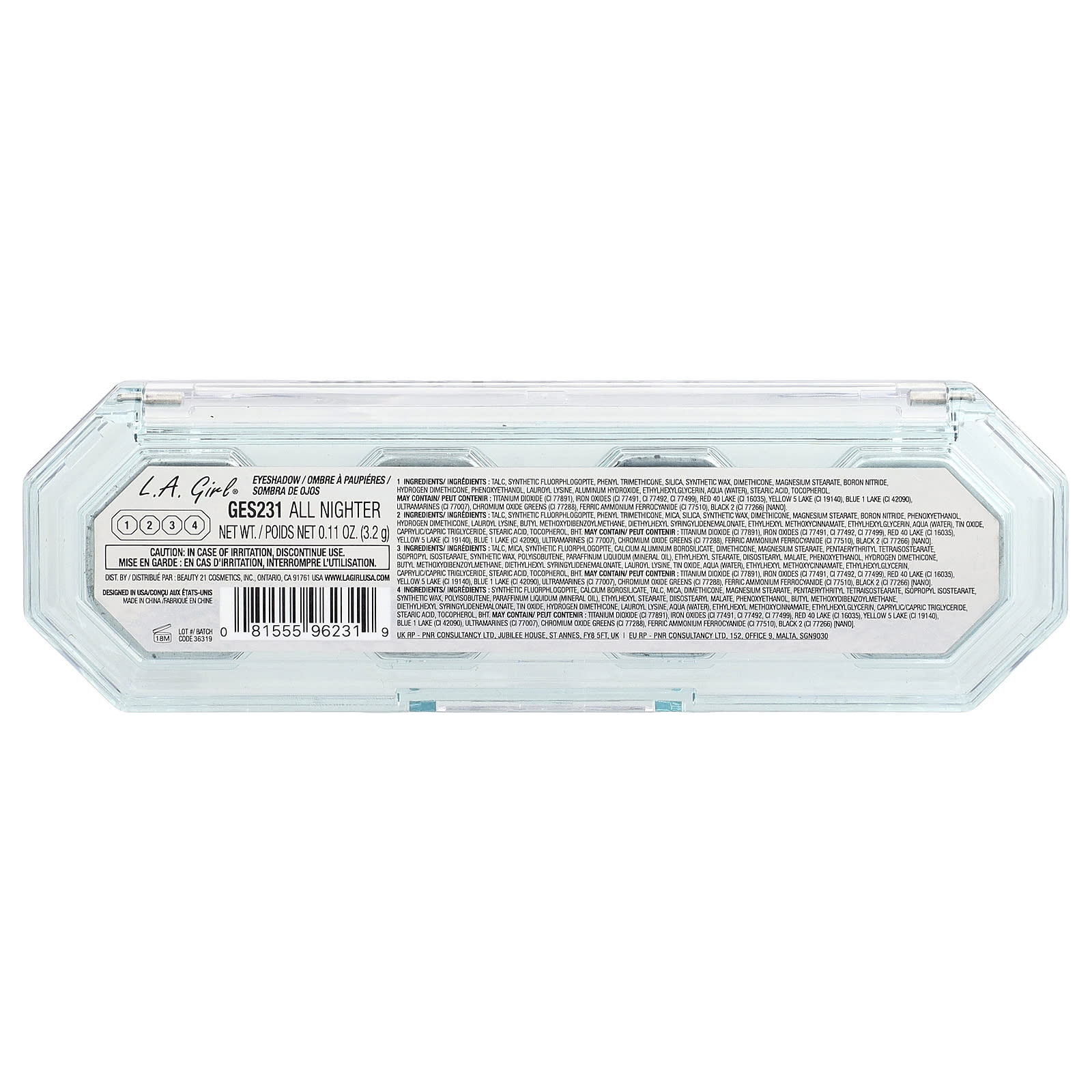 - Синтетический фторфлагопит, боросиликат кальция, тальк, слюда, диметикон, стеарат магния, пентаэритритил тетраизостеарат, изопропил изостеарат, синтетический воск, полиизобутен, вазелиновое масло (Paraffinum liquidum), этилгексил стеарат, диизостеарил малат, феноксиэтанол, бутилметоксидибензоилметан, диэтилгексил сирингилиденоксид, водород диметикон, лаурил лизин, вода, этилгексил метоксициннамат, этилгексилглицерин, каприловый/каприновый триглицерид, стеариновая кислота, токоферол, бутилгидрокситолуол. Может содержать диоксид титана (CI 77891), оксиды железа (CI 77491, CI 77492, CI 77499), краситель красный 40 лак (CI 16035), краситель желтый 5 лак (CI 19140), краситель синий 1 лак (CI 42090), ультрамарины (CI 77007), краситель зеленый оксид хрома (CI 77288), ферроцианид железа-аммония (CI 77510), краситель черный 2 (CI 77266) [нано].