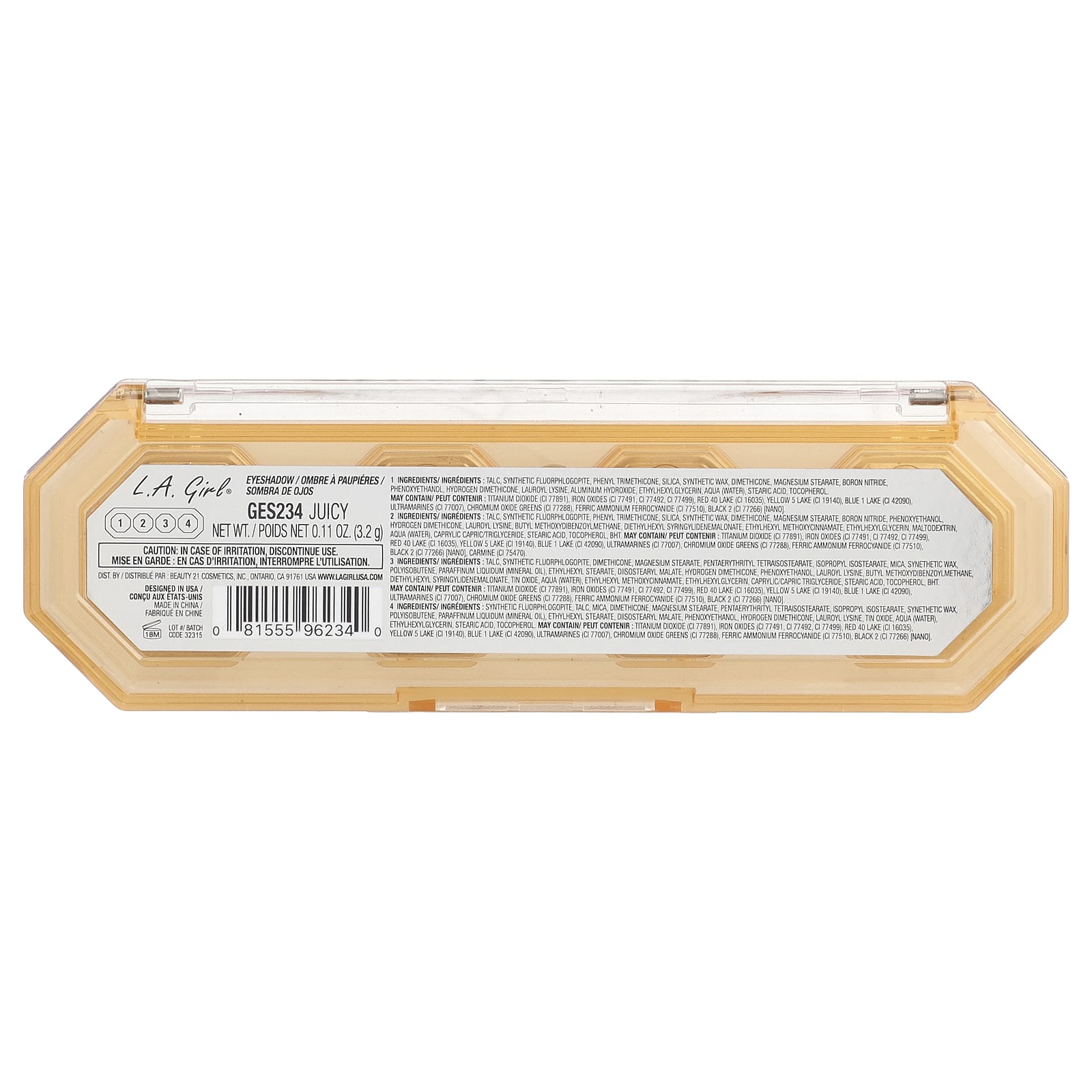 - Тальк, синтетический фторфлагопит, фенилтриметикон, диоксид кремния, синтетический воск, диметикон, стеарат магния, нитрид бора, феноксиэтанол, диметикон водорода, лаурил лизин, бутил метоксидибензоилметан, диэтилгексил сирингилиденмалонат, этилгексил метоксициннамат, этилгексилглицерин, мальтодекстрин, вода, каприловый каприновый/триглицерин кислота, токоферол, бутилгидрокситолуол. Может содержать диоксид титана (CI 77891), оксиды железа (CI 77491, CI 77492, CI 77499), краситель красный 40 лак (CI 16035), краситель желтый 5 лак (CI 19140), краситель синий 1 лак (CI 42090), ультрамарины (CI 77007), зелень с оксидом хрома (CI 77288), ферроцианид железа-аммония (CI 77510), краситель черный 2 (CI 77266) [нано], кармин (CI 75470).