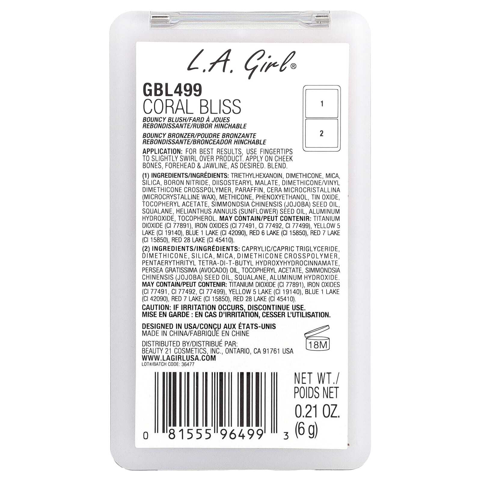 Румяна: триэтилгексаноин, диметикон, слюда, диоксид кремния, нитрид бора, диизостеарил малат, диметикон/винил диметикон кроссполимер, парафина, микрокристаллический воск (Cera микрокристаллический), метикон, феноксиэтанол, оксид олова, токоферилацетат, масло из семян жожоба (Simmondsia chinensis), сквалан, подсолнечное масло (Helianthus annuus), гидроксид алюминия, токоферол.