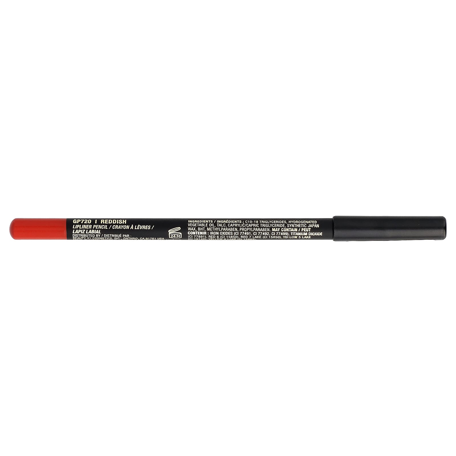 C10-18 триглицериды, гидрогенизированное растительное масло, тальк, каприловый/каприновый триглицерид, синтетический японский воск, бутилгидрокситолуол, метилпарабен, пропилпарабен. Может содержать оксиды железа (CI 77491, CI 77492, CI 77499), диоксид титана (CI 77891). краситель красный 6 (CI 15850), краситель красный 7 лак (CI 15850), краситель жёлтый 5 лак (CI 19140), краситель желтый 6 лак (CI 15985).
