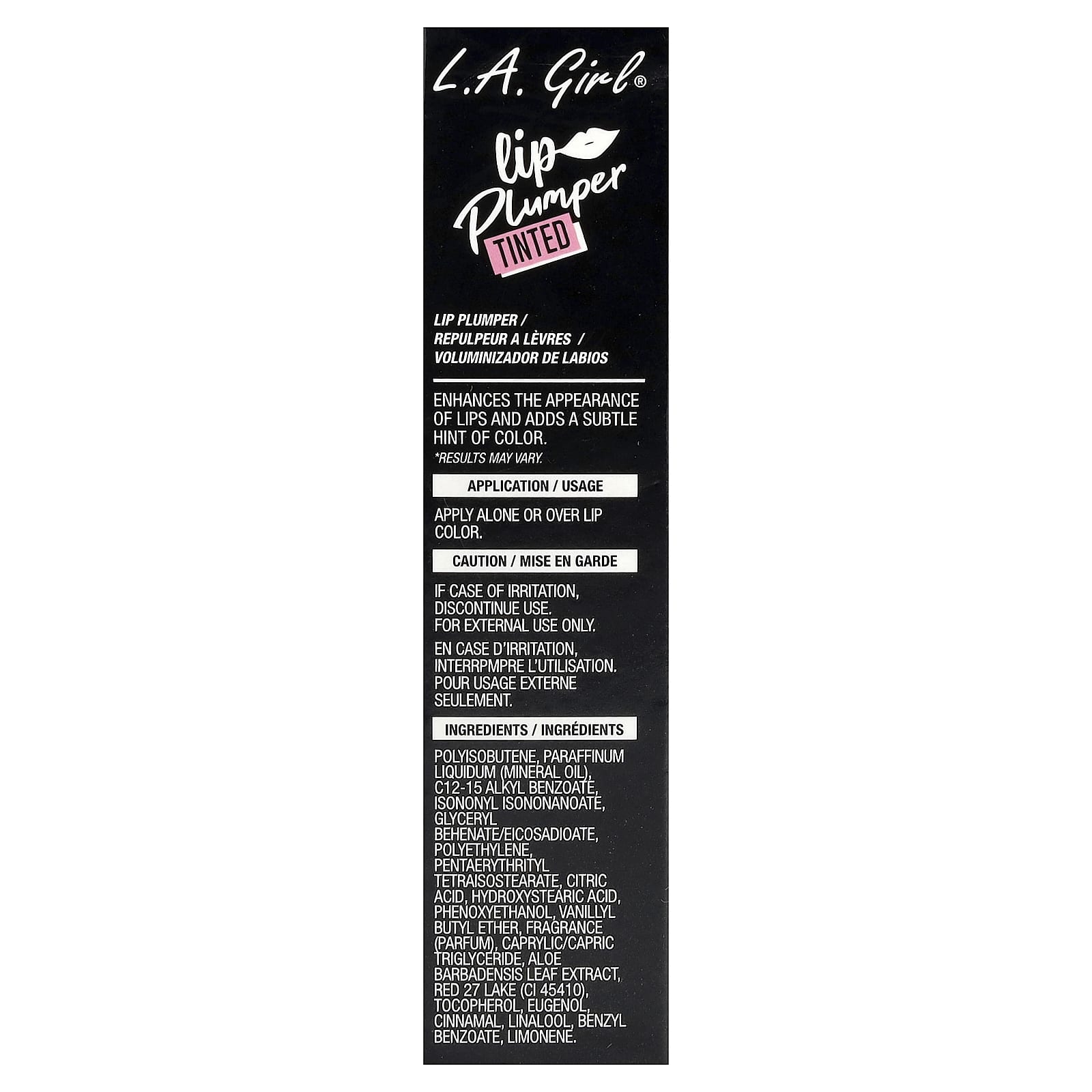 Полиизобутен, минеральное масло (paraffinum liquidum), c12-15 алкил бензоат, изононил изононаноат, глицерил бегенат/эйкозадиоат, полиэтилен, пентаэритритилтетраизостеарат, лимонная кислота, гидроксистеариновая кислота, феноксиэтанол, ванилил бутиловый эфир, отдушка, каприловый/каприновый триглицерид, экстракт листьев алоэ-вера (aloe barbadensis), краситель красный 27 (CI 45410), циннамиловый спирт, эвгенол, циннамаль, линалоол, бензил бензоат, лимонен.
