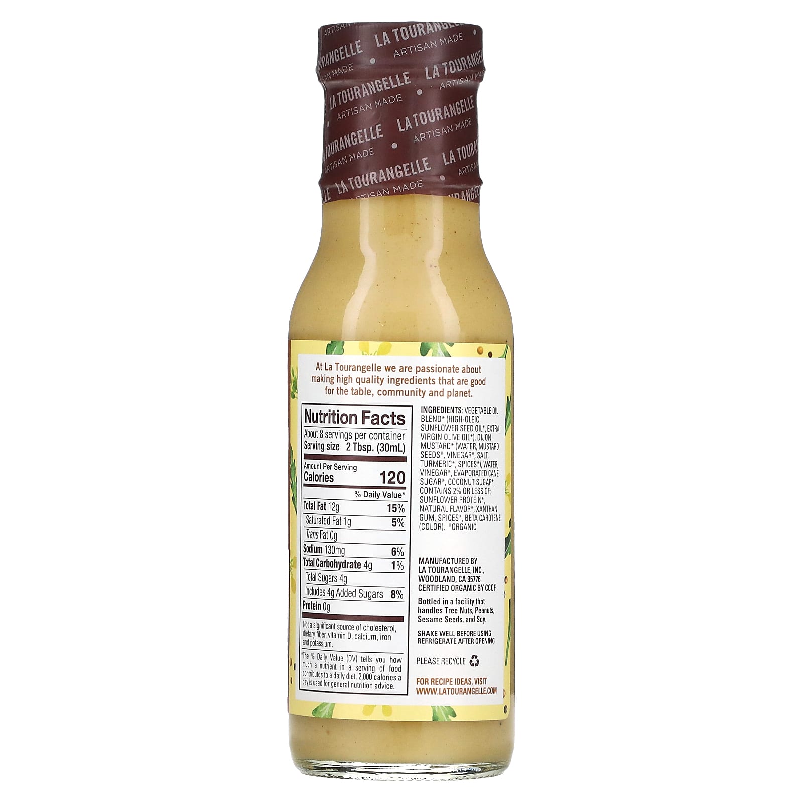 Смесь растительных масел * (высокоолеиновое подсолнечное масло *, оливковое масло холодного отжима *), дижонская горчица * (вода, семена горчицы *, уксус *, соль, куркума *, специи *), вода, уксус *, выпаренный тростниковый сахар *, кокосовый сахар *, содержит не более 2% подсолнечного протеина *, натуральный ароматизатор *, ксантановая камедь, специи *, бета-каротин (краситель).