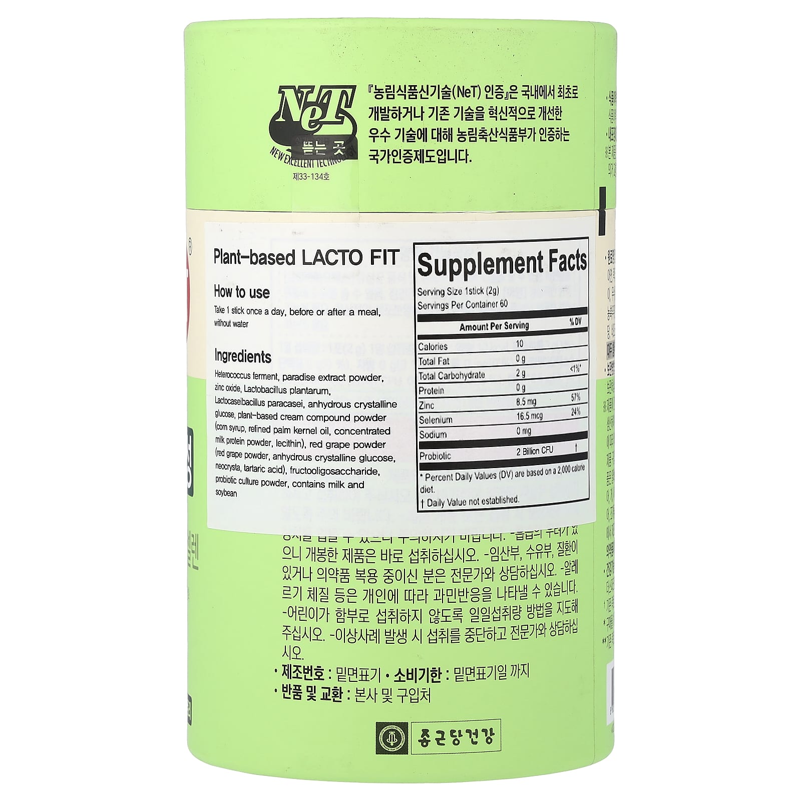Фермент Heterococcus, порошок из экстракта грейпфрута, оксид цинка, лактобактерии плантарум (Lactobacillus plantarum), лактоказеибактерии параказеи (Lactobacillus paracasei), безводная кристаллическая глюкоза, порошок из сливок на растительной основе (кукурузный сироп, рафинированное пальмоядровое масло, порошок из концентрированного молочного протеина, лецитин), порошок из красного винограда (порошок из красного винограда, безводная кристаллическая глюкоза, Neocrysta, винная кислота), фруктоолигосахарид, порошок пробиотических культур.
