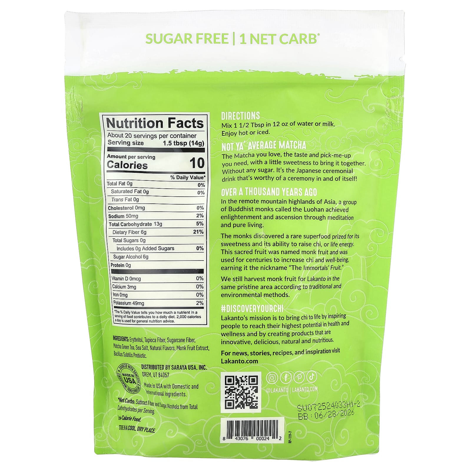 Подсластитель из архата от Lakanto® (эритритол и экстракт плодов архата), тапиоковая клетчатка, клетчатка из сахарного тростника, матча, натуральные ароматизаторы, кальций и магний из морских водорослей, морская соль, целлюлозная камедь, пробиотик Bacillus subtilis, подсолнечный лецитин.