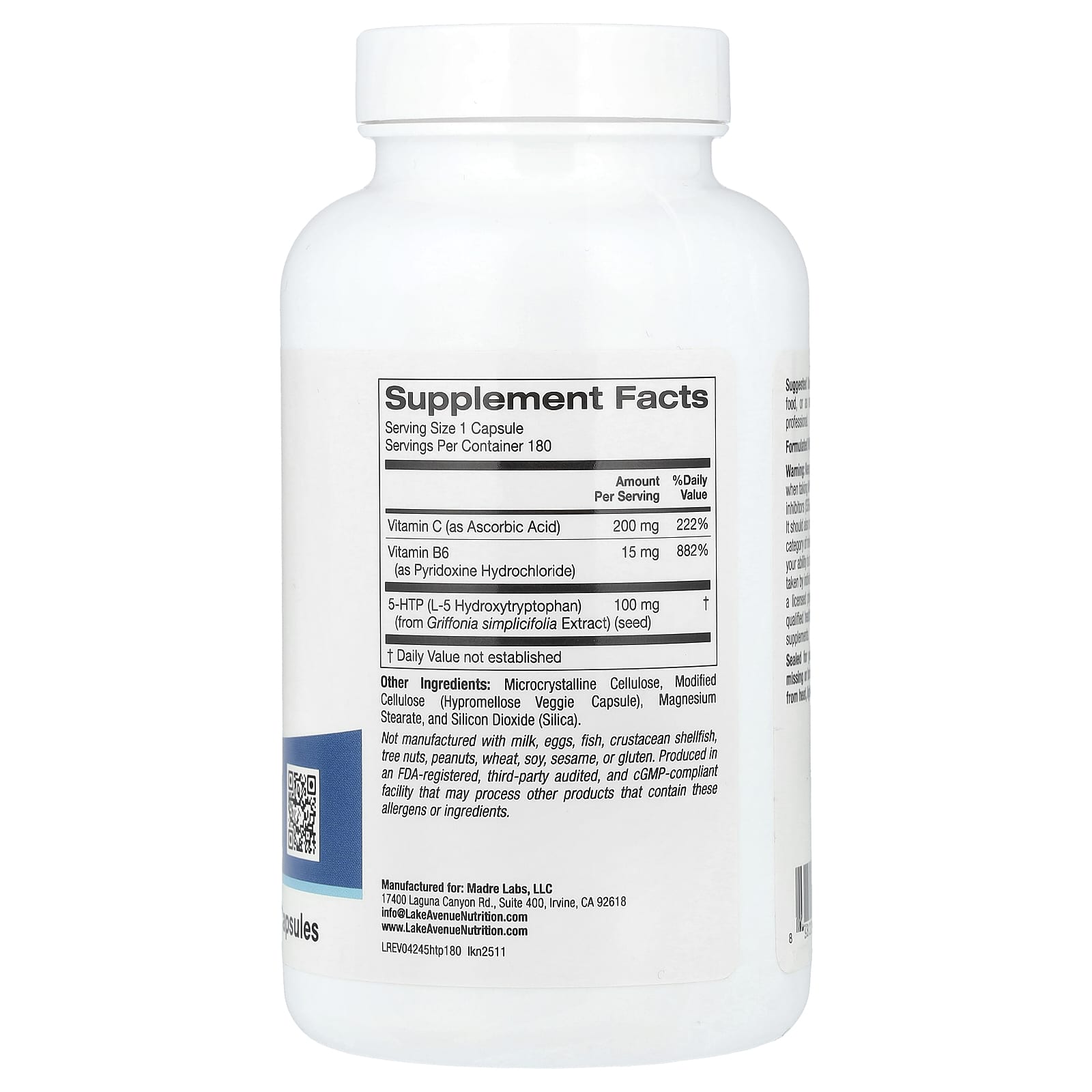 5-HTP с витаминами B6 и C от Lake Avenue® Nutrition содержит 5-гидрокситриптофан, а также витамины B6 и C в растительных капсулах.