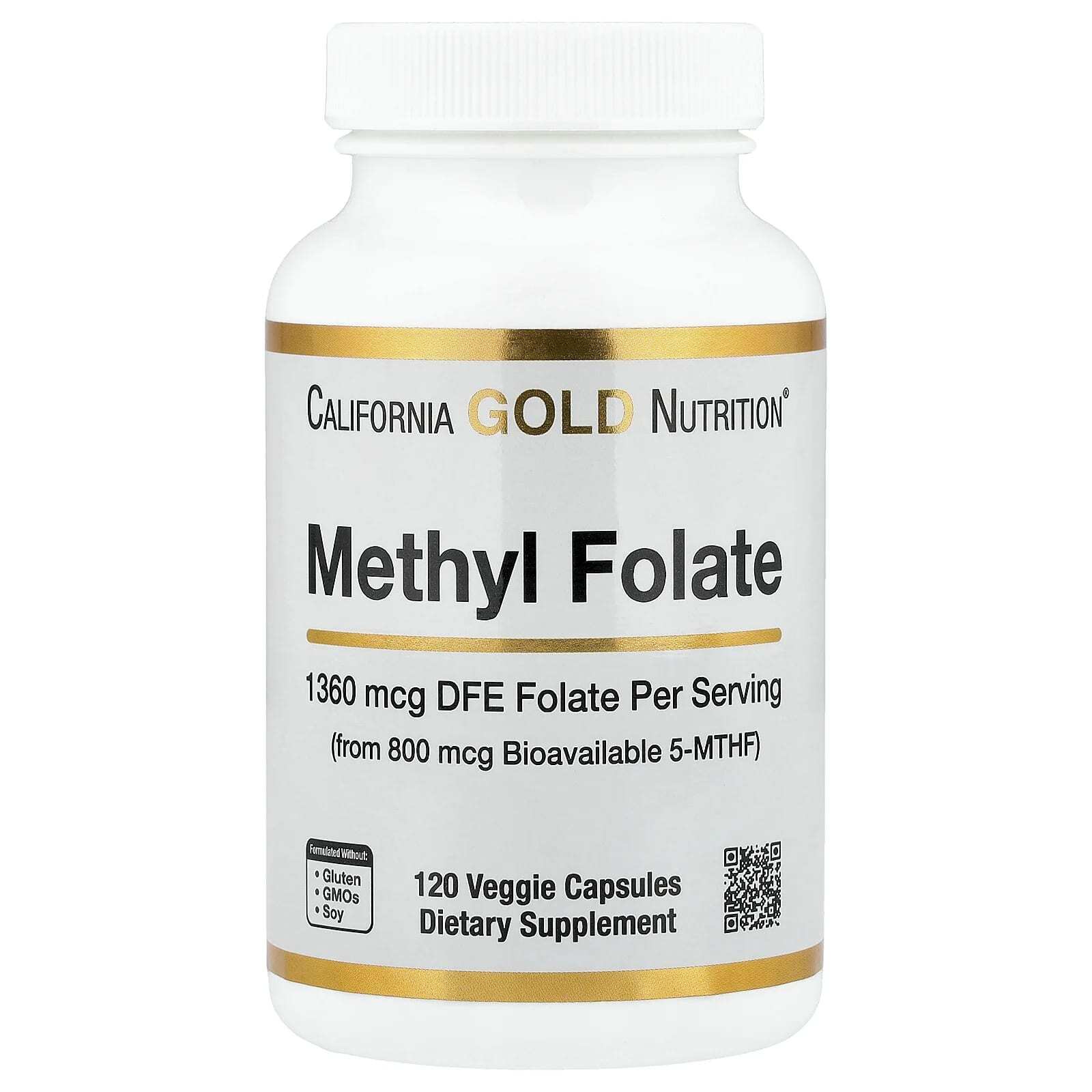 California Gold Nutrition® Метилфолат содержит 800 мкг фолата в виде 6S-5-метилтетрагидрофолиевой кислоты (5-MTHF) на 1 порцию в растительных капсулах.
