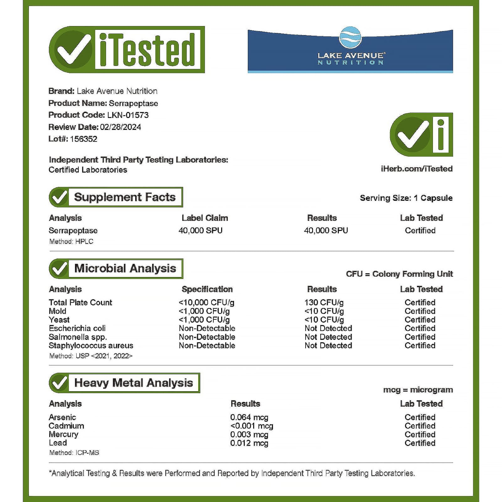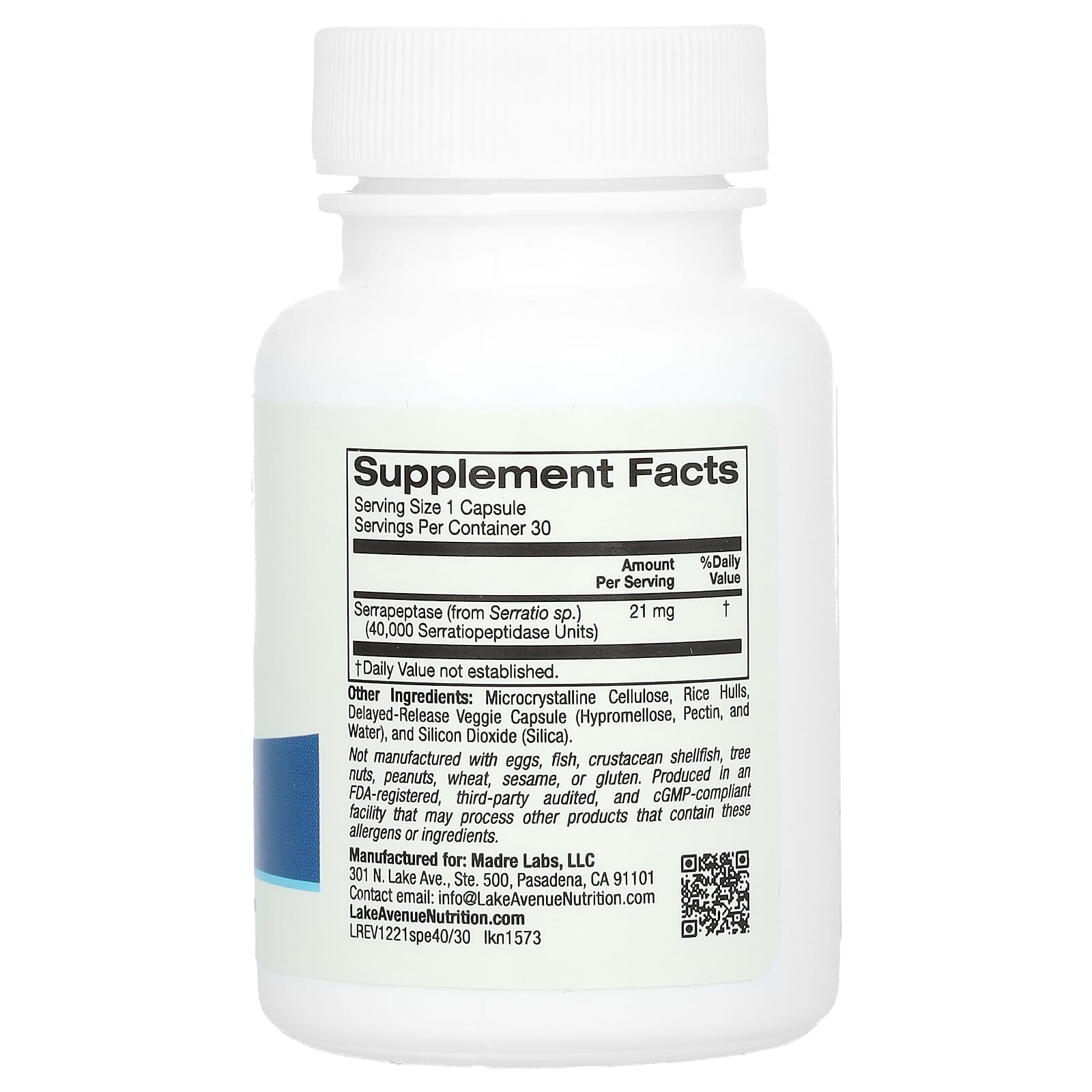 Протеолитический фермент серрапептаза от Lake Avenue® Nutrition содержит серрапептазу вида Serratio. Добавка подходит для вегетарианцев, не содержит глютена и ГМО.