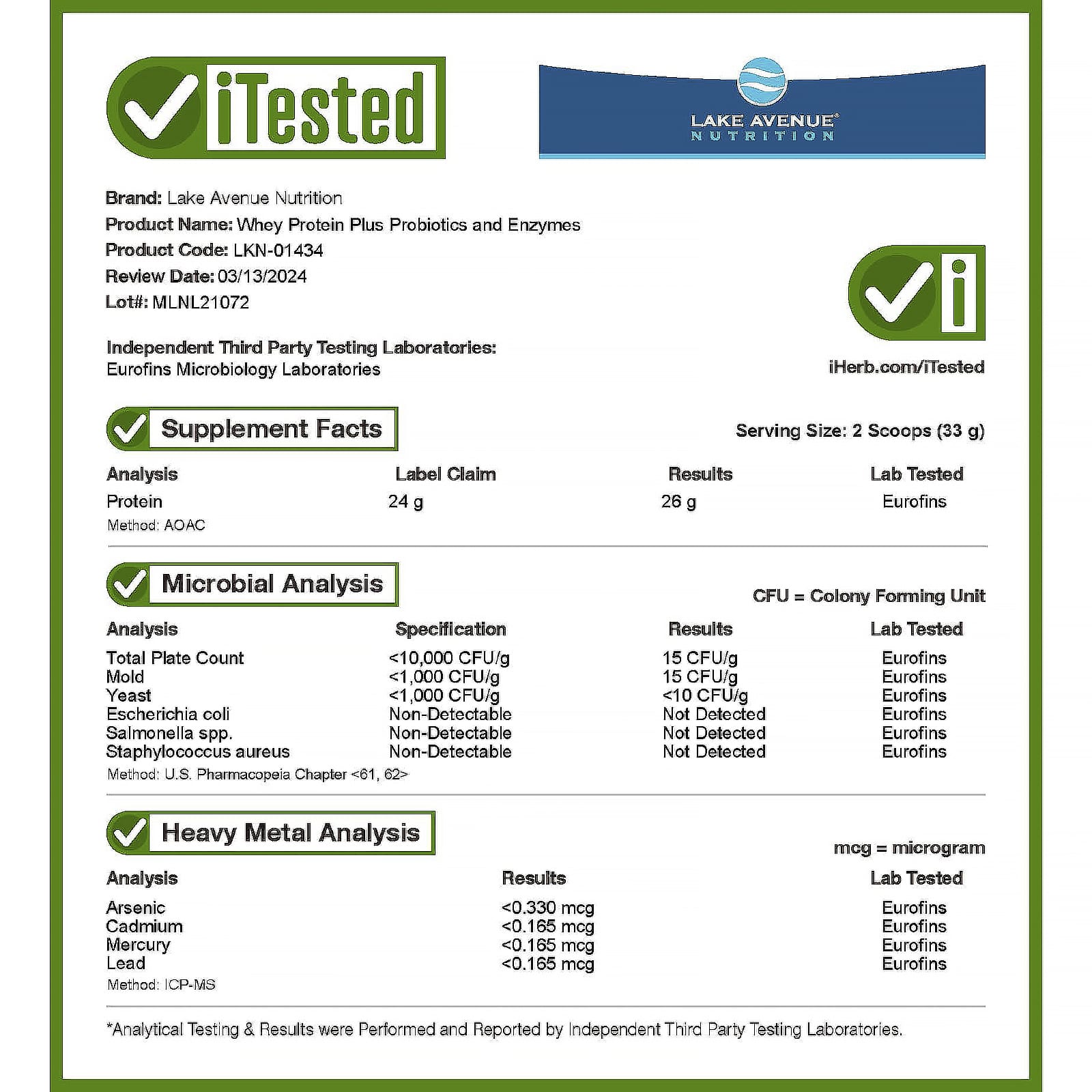 При производстве не используются яйца, рыба, моллюски и ракообразные, древесные орехи, арахис, пшеница, сои, кунжут, глютен. Произведено на предприятии, имеющем регистрацию Управления по контролю качества пищевых продуктов и лекарственных средств США, которое проходит независимые проверки, имеет регистрацию текущей надлежащей производственной практики (cGMP), и где также могут обрабатываться другие продукты, содержащие эти аллергены или ингредиенты.