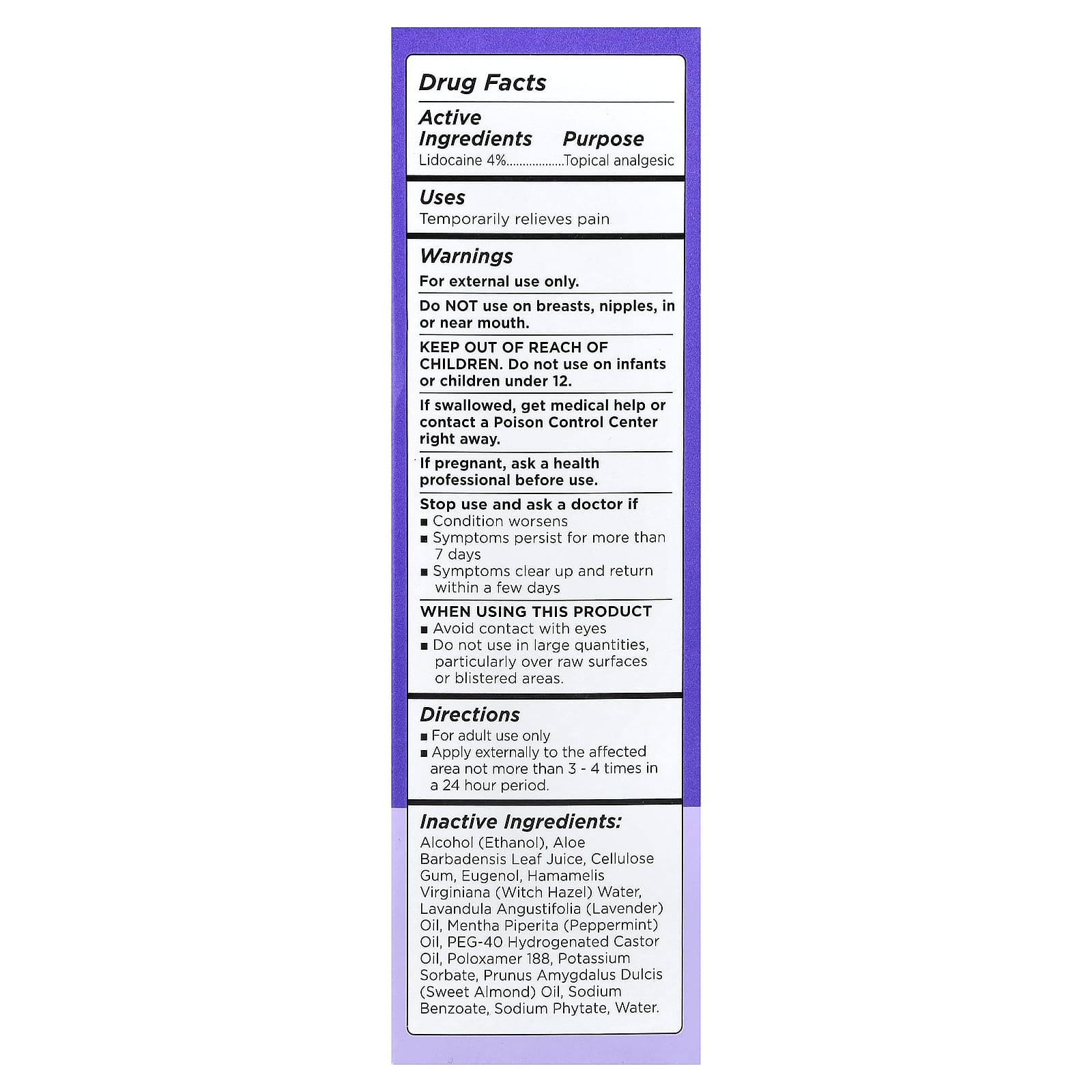 Снимает боль с помощью лидокаина и успокаивающей смеси растительных ингредиентов.