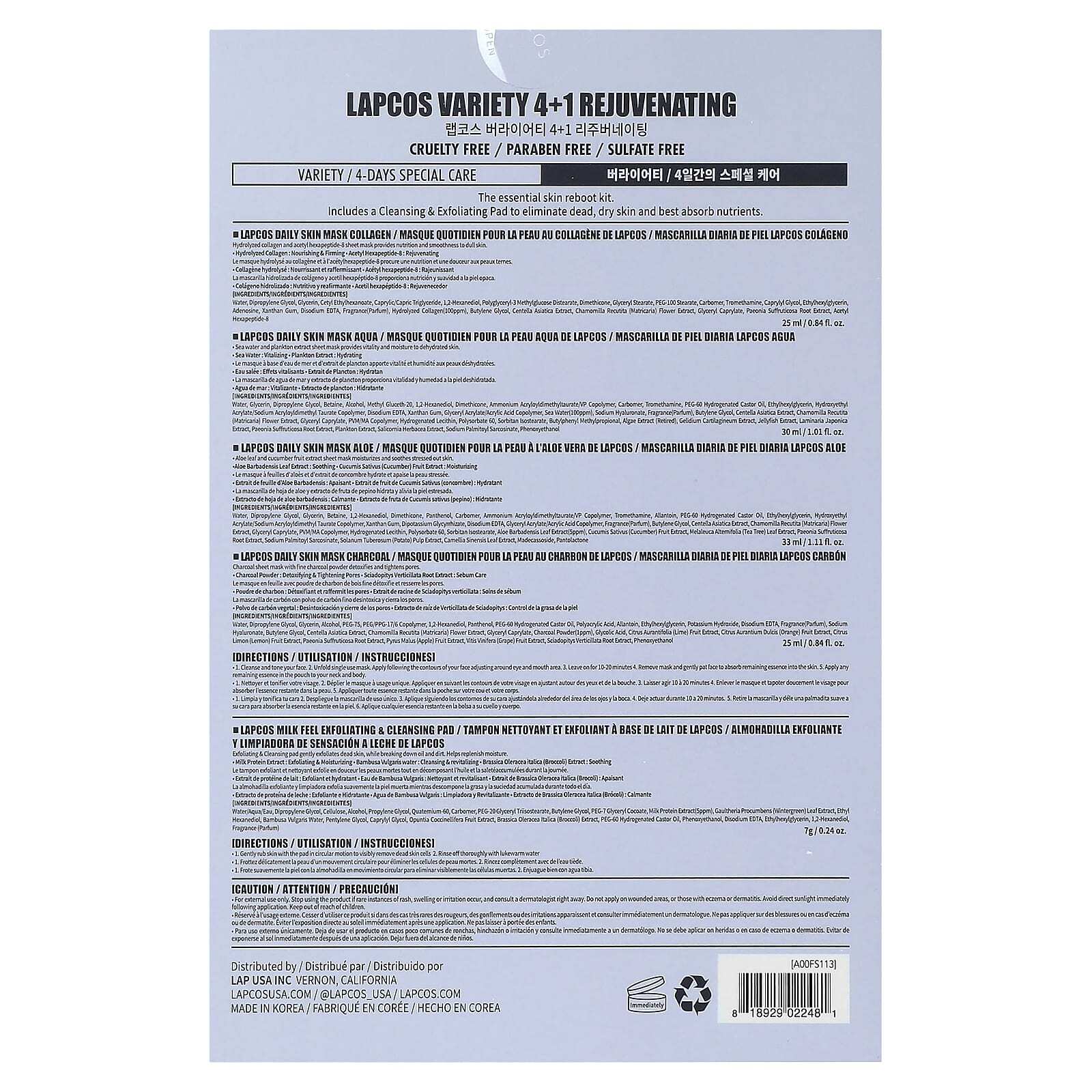 Ежедневная маска для кожи Lapcos Aqua: Вода, глицерин, дипропиленгликоль, бетаин, спирт, метил глюцет-20,1,2-гександиол, диметикон, аммоний акрилоилдиметилтаурат/ВП сополимер, карбомер, трометамин, ПЭГ-60 гидрогенизированное касторовое масло, этилгексилглицерин, гидроксиэтил акрилат/натрия акрилоилдиметилтаурата сополимер, двунатриевая ЭДТК, ксантановая камедь, сополимер глицерил акрилата/акриловой кислоты, морская вода (100 част. / млн), гиалуронат натрия, отдушка (парфюмерная композиция), бутиленгликоль, экстракт готу колы (Centella asiatica), экстракт цветков ромашки лекарственной (Chamomilla recutita), глицерил каприлат, ПВМ/МА сополимер, гидрогенизированный лецитин, полисорбат 60, сорбитан изостеарат, бутилфенил метилпропиональ, экстракт водорослей (ранее), экстракт агарофита (Gelidium cartilagineum), экстракт медузы, экстракт ламинарии японской (Laminaria japonica), экстракт корня пиона (Paeonia suffruticosa), экстракт планктона, экстракт солероса европейского (Salicornia herbacea), пальмитоил саркозинат натрия, феноксиэтанол.