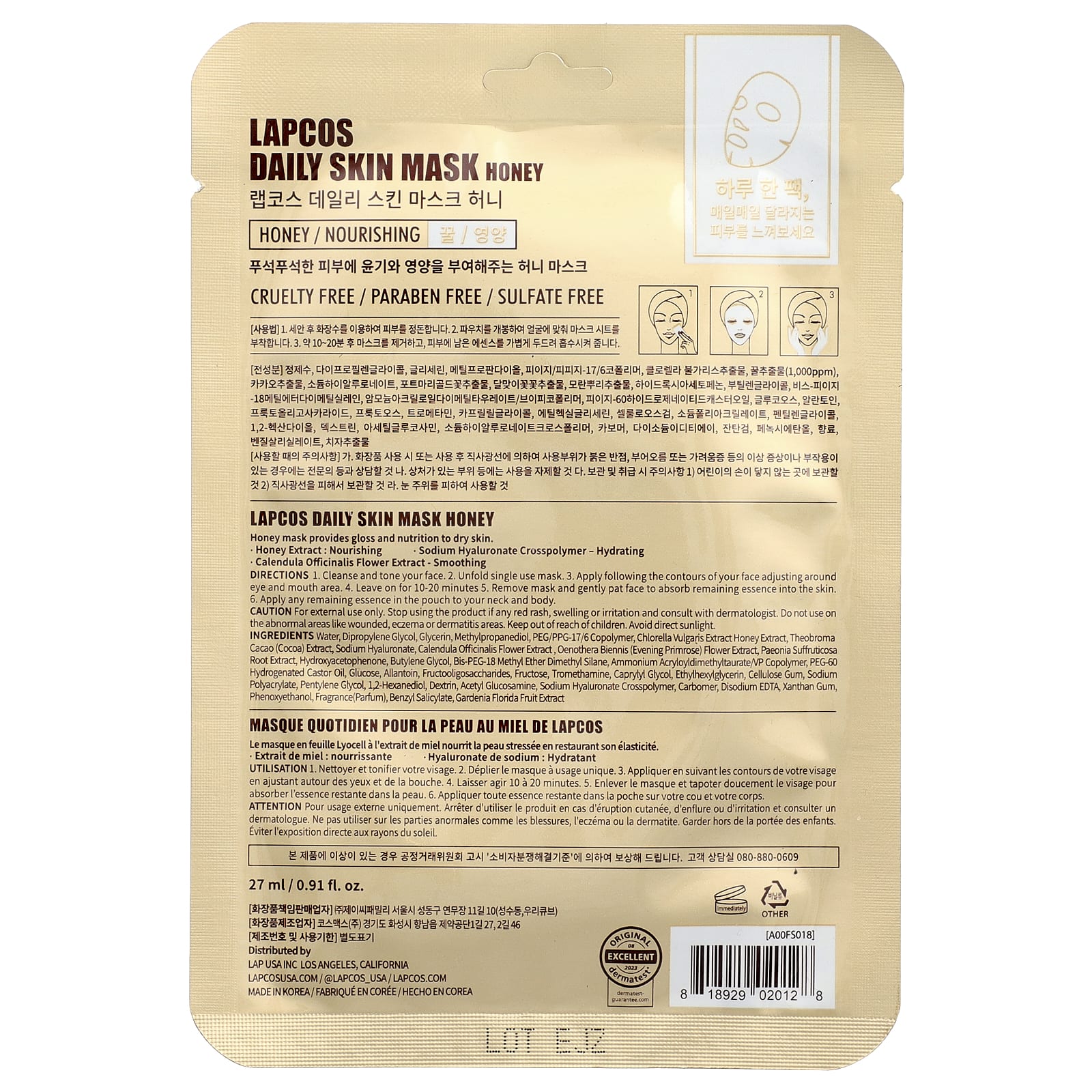 Lapcos, ежедневная медовая маска, питательная, 1 шт., 27 мл (0,91 жидк. унции)