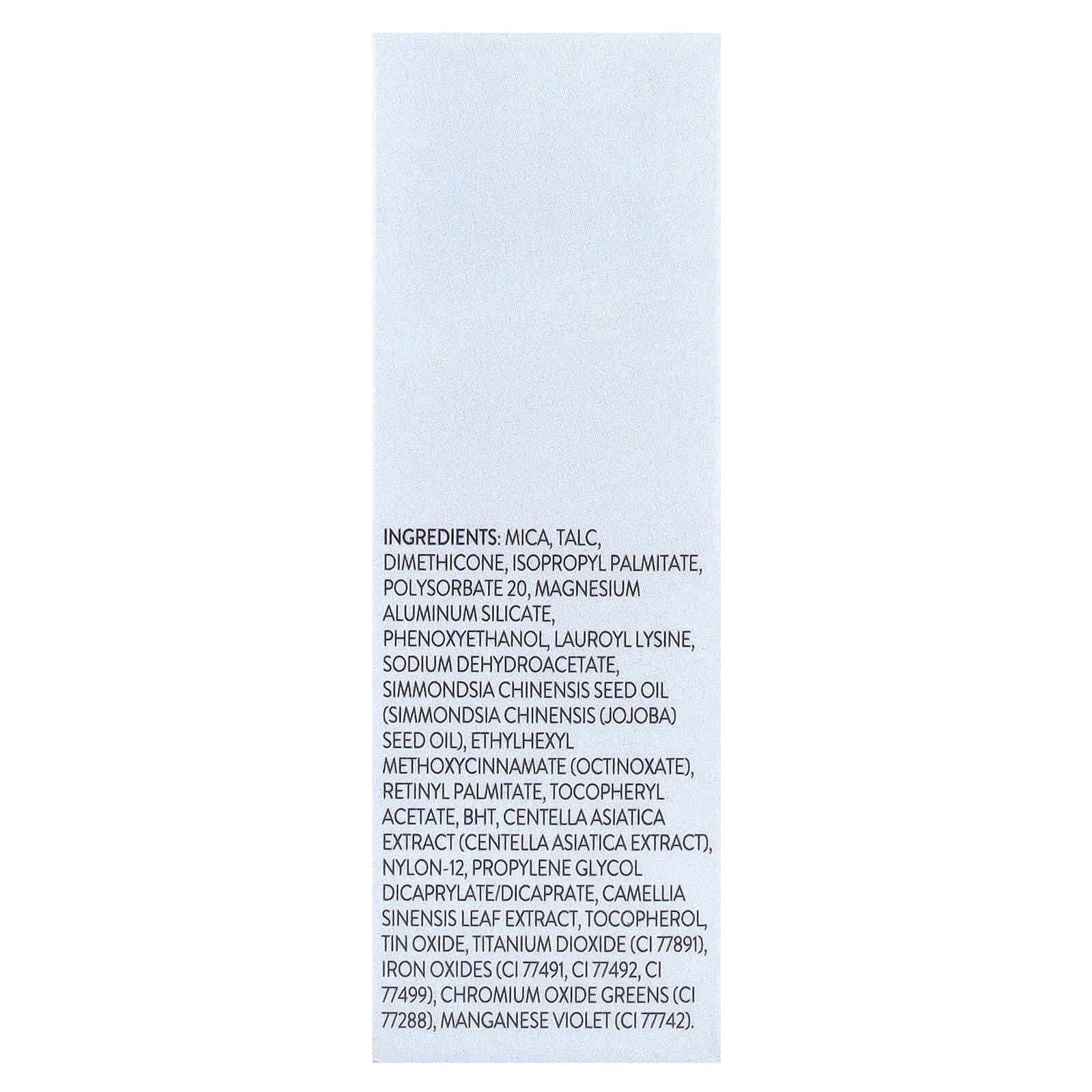 слюда, тальк, диметикон, изопропилпальмитат, полисорбат 20, алюмосиликат магния, феноксиэтанол, лаурил лизин, дегидроацетат натрия, масло семян жожоба (Simmondsia chinensis), этилгексил метоксициннамат (октиноксат), ретинилпальмитат, токоферилацетат, бутилгидрокситолуол, экстракт центеллы азиатской (Centella asiatica), нейлон-12, пропиленгликоль дикаприлат/дикапрат, экстракт листьев зеленого чая (Camellia sinensis), токоферол оксид олова, диоксид титана (CI 77891), оксиды железа (CI 77491, CI 77492, CI 77499), хромовую зелень (CI 77288), марганцево-фиолетовый (CI 77742).