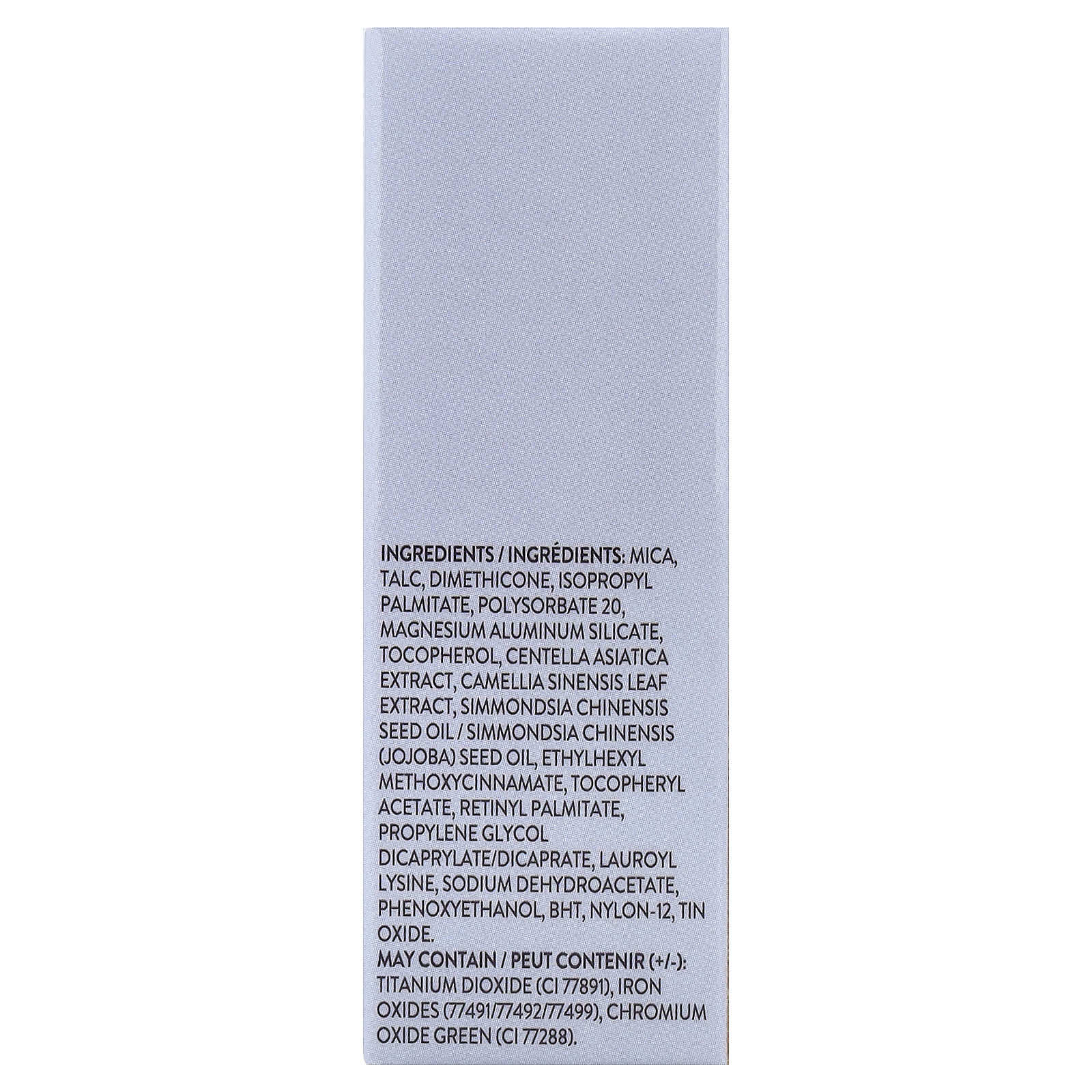 слюда, тальк, диметикон, изопропилпальмитат, полисорбат 20, силикат магния и алюминия, токоферол, экстракт готу колы (Centella asiatica), экстракт листьев зеленого чая (Camellia sinensis), масло семян Simmondsia chinensis / масло семян жожоба (Simmondsia chinensis), этилгексил метоксициннамат, токоферилацетат, ретинилпальмитат, пропиленгликоль дикаприлат/дикапрат, лаурил лизин, дегидроацетат натрия, феноксиэтанол, бутилгидрокситолуол, нейлон-12, оксид олова. Может содержать (+/-) диоксид титана (CI 77891), оксиды железа (77491/77492/77499), оксид хрома зеленый (CI 77288).