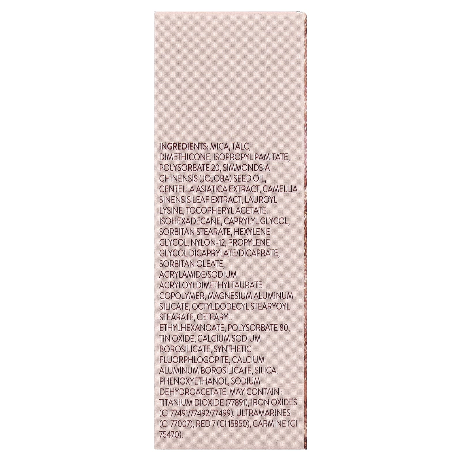 слюда, тальк, диметикон, изопропил памитат, полисорбат 20, масло из семян жожоба (Simmondsia chinensis), экстракт готу колы (Centella asiatica), экстракт листьев зеленого чая (Camellia sinensis), лаурил лизин, токоферилацетат, изогексадекан, каприлилгликоль, сорбитан стеарат, гексиленгликоль, нейлон-12, пропиленгликоль дикаприлат/дикапрат, сорбитанолеат, акриламид/натрия акрилоилдиметилтаурат сополимер, алюмосиликат магния, октилдодецил стеариоил стеарат, цетеариловый этилгексаноат, полисорбат 80, оксид олова, кальций натрий боросиликат, синтетический фторфлогопит, кальций алюминий боросиликат, диоксид кремния, феноксиэтанол, дегидроацетат натрия Может содержать Диоксид титана (77891), оксиды железа (CI 77491/77492/77499), ультрамарины (CI 77007), краситель красный 7 (CI 15850), кармин (CI 75470).