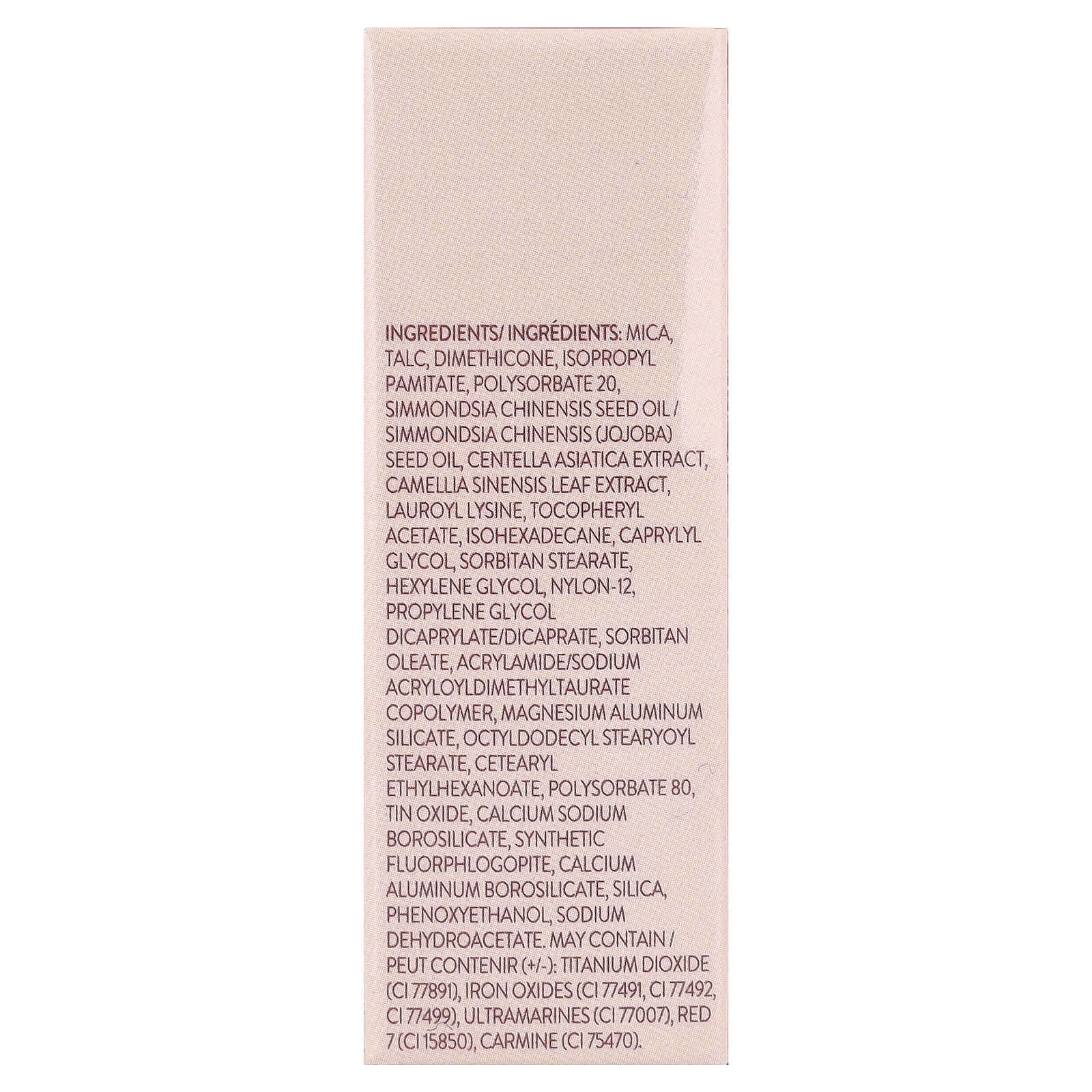 слюда, тальк, диметикон, изопропилпальмитат, полисорбат 20, масло семян Simmondsia chinensis / масло семян жожоба (Simmondsia chinensis), экстракт готу колы (Centella asiatica), экстракт листьев зеленого чая (Camellia sinensis), лаурил лизин, токоферилацетат, изогексадекан, каприлилгликоль, сорбитан стеарат, гексиленгликоль, нейлон-12, пропиленгликоль дикаприлат/дикапрат, сорбитанолеат, акриламид/натрия акрилоилдиметилтаурат сополимер, алюмосиликат магния, октилдодецил стеароил стеарат, цетеариловый этилгексаноат, полисорбат 80 оксид олова, кальций натрий боросиликат, синтетический фторфлогопит, кальций алюминий боросиликат, диоксид кремния, феноксиэтанол, дегидроацетат натрия. / peut contenir (+/-): диоксид титана (CI 77891), оксиды железа (CI 77491, CI 77492, CI 77499), ультрамарины (CI 77007), краситель красный 7 (CI 15850), кармин (CI 75470).