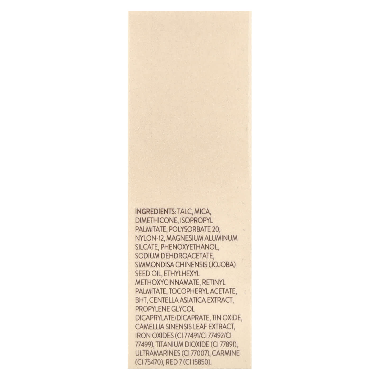 Тальк, слюда, диметикон, изопропилпальмитат, полисорбат 20 нейлон-12, силикат магния и алюминия, феноксиэтанол, дегдроацетат натрия, масло семян жожоба (Simmondisa chinensis), этилгексил метоксициннамат, ретинилпальмитат, токоферилацетат, бутилгидрокситолуол, экстракт готу колы (Centella asiatica), пропиленгликоль дикаприлат/дикапрат, оксид олова, экстракт листьев камелии китайской (Camellia sinensis), оксиды железа (CI 77491 / CI 77492 / CI 77499), диоксид титана (CI 77891), ультрамарины (CI 77007), кармин (CI 75470), красный 7 (CI 15850).