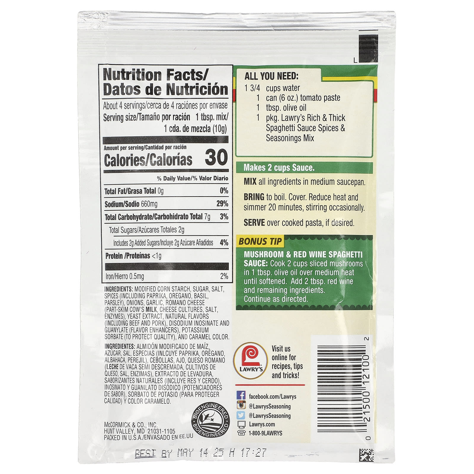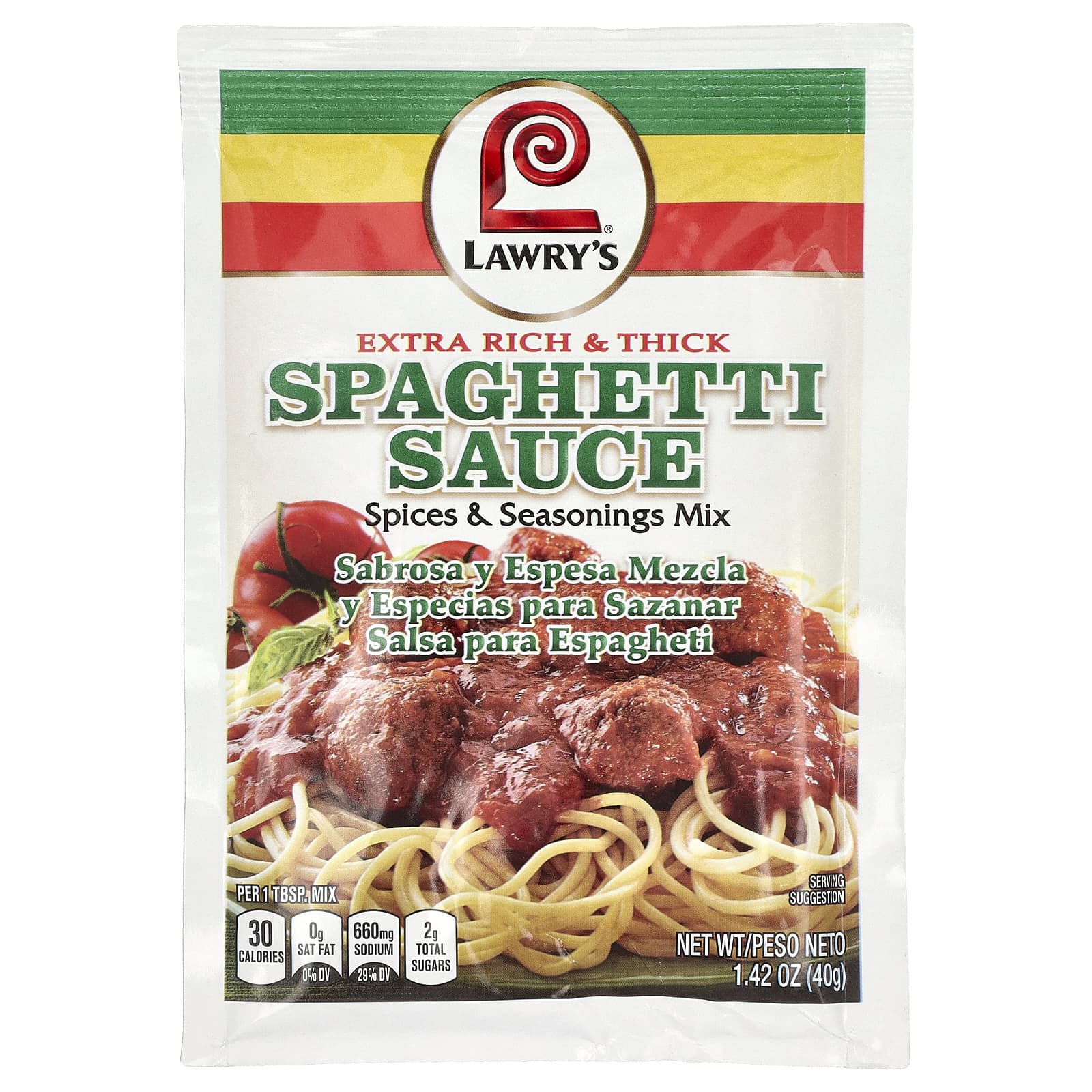 Смесь для соуса для спагетти от Lawry - это непревзойденный вкус и удобство. Он готовится за несколько минут, но хранится до 8 часов. При охлаждении или замораживании продукт не теряет вкуса, текстуры и внешнего вида. Создано специально для шеф-поваров, чтобы создавать необычные блюда и готовить единообразные блюда. Простой и удобный способ приготовить ароматный соус для спагетти или соуса для пиццы