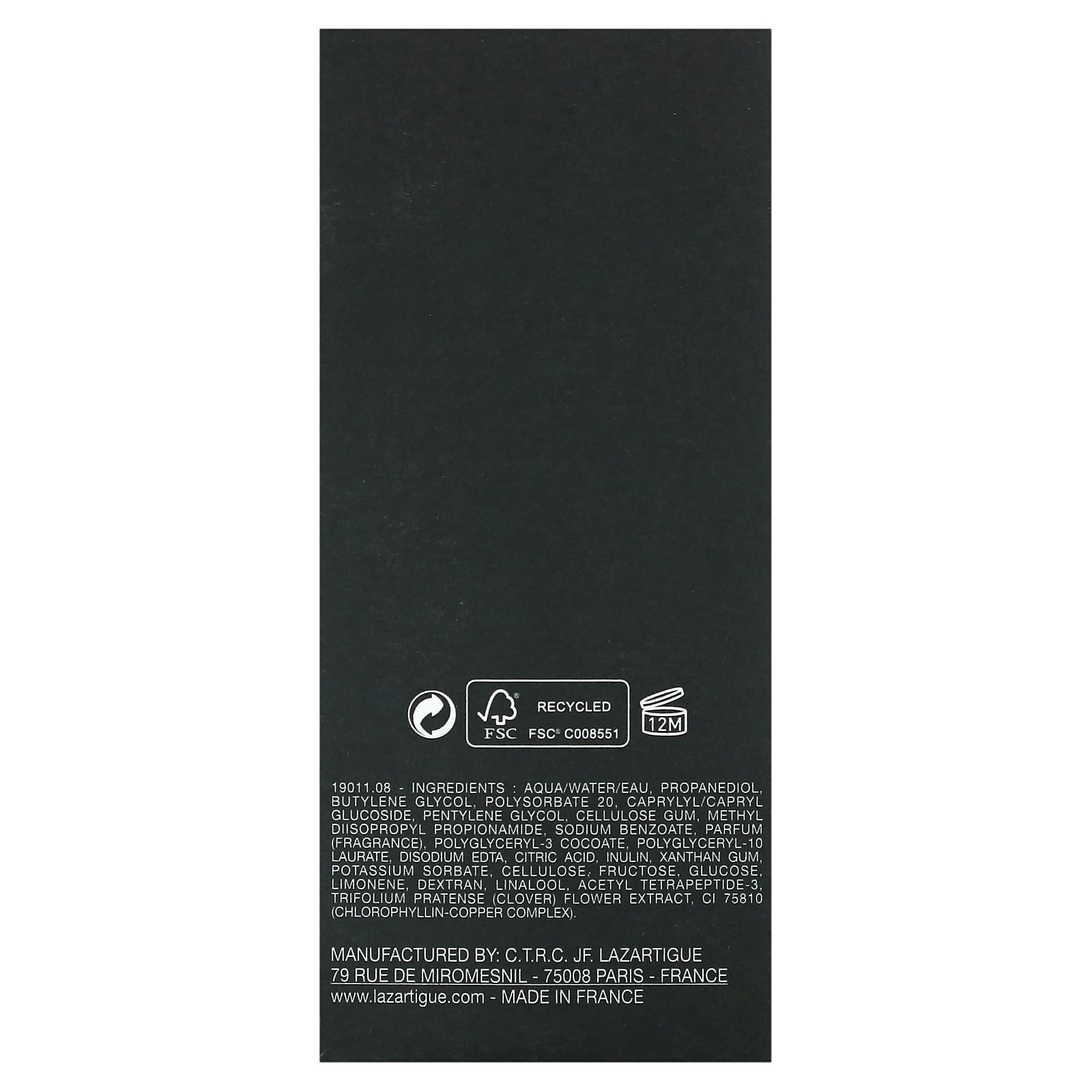 Вода (Aqua/eau), пропандиол, бутиленгликоль, полисорбат 20, каприлил/каприл глюкозид, пентилен гликоль, целлюлозная камедь, метил диизопропил пропионамид, бензоат натрия, парфюмерная композиция), полиглицерил-3 кокоат, полиглицерил-10 лаурат, двунатриевая ЭДТК, лимонная кислота, инулин, ксантановая камедь, сорбат калия, целлюлоза, фруктоза, глюкоза лимонен, декстран, линалоол, ацетил тетрапептид-3, экстракт цветков красного клевера (Trifolium pratense), комплекс хлорофиллина с медью (CI 75810).