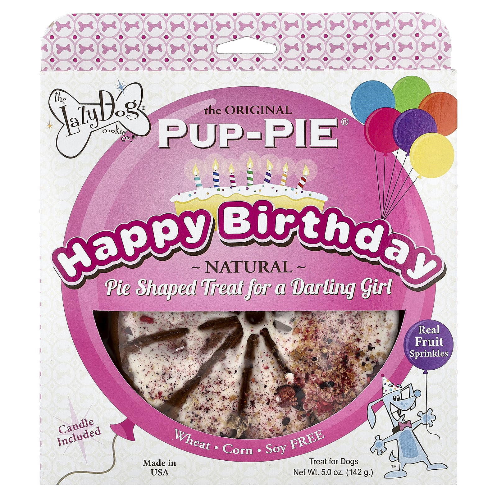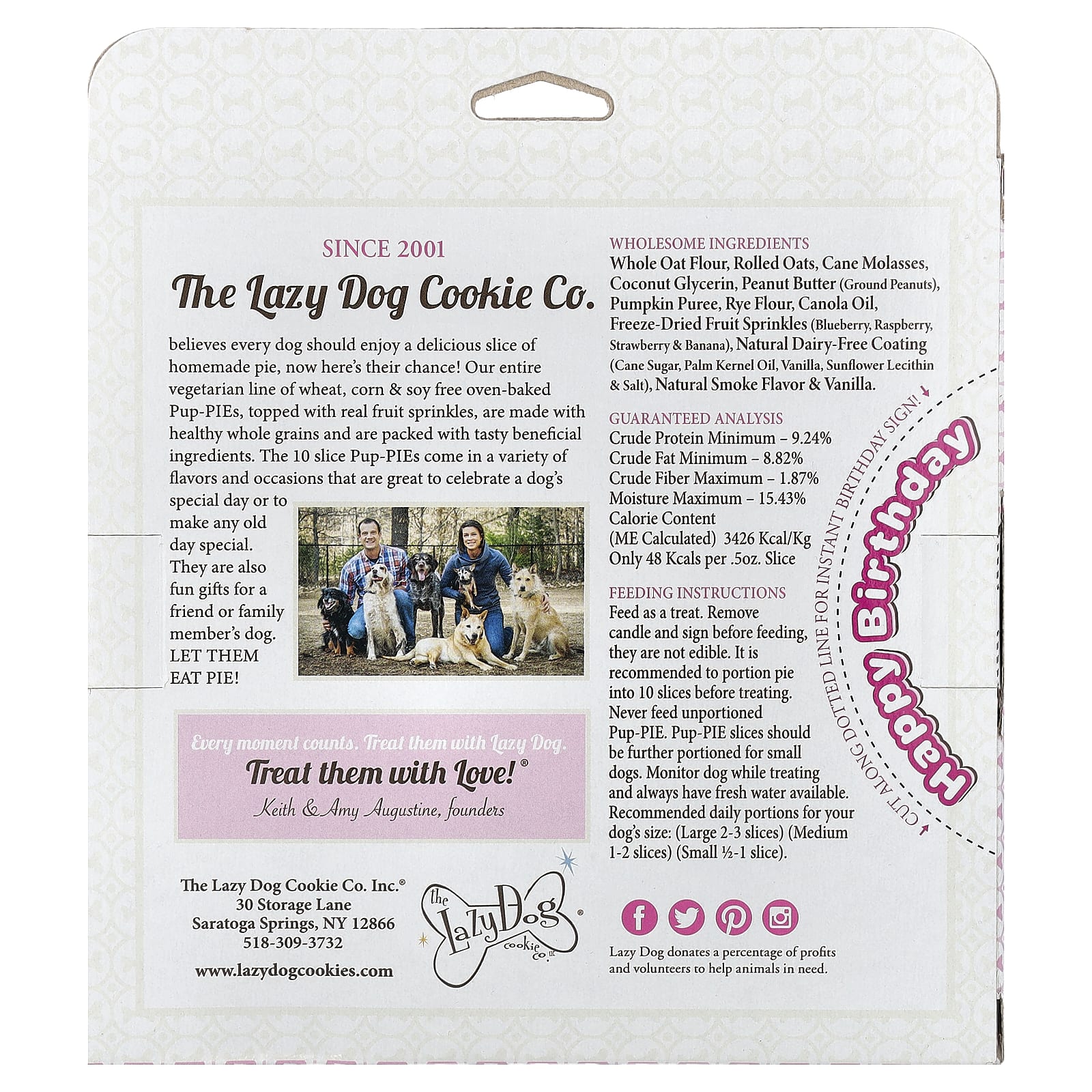 Компания Lazy Dog Cookie Co. считает, что каждая собака должна насладиться кусочком восхитительного домашнего пирога. Теперь это их шанс! Наша вегетарианская линейка Pup-PIE, запеченных в духовке, без пшеницы, кукурузы и сои, с добавлением настоящей фруктовой посыпки, изготовлена из полезных цельных злаков и содержит вкусные полезные ингредиенты. Pup-PIEs с 10 ломтиками имеют разные вкусы и случае, и они отлично подходят для празднования особенного дня собаки или особенного дня. Это также забавный подарок для собаки друга или члена семьи. Позвольте им есть пирог!