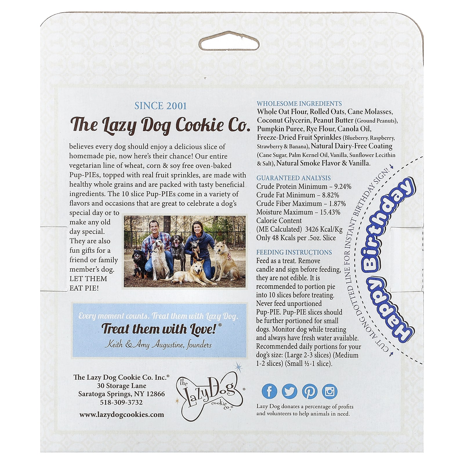 Компания Lazy Dog Cookie Co. считает, что каждая собака должна насладиться кусочком восхитительного домашнего пирога. Теперь это их шанс! Наша вегетарианская линейка Pup-PIE, запеченных в духовке, без пшеницы, кукурузы и сои, с добавлением настоящей фруктовой посыпки, изготовлена из полезных цельных злаков и содержит вкусные полезные ингредиенты. Pup-PIEs с 10 ломтиками имеют разные вкусы и позволяют отпраздновать особый день для собаки или любой другой день. Это также забавный подарок для собаки друга или члена семьи. Позвольте им есть пирог!