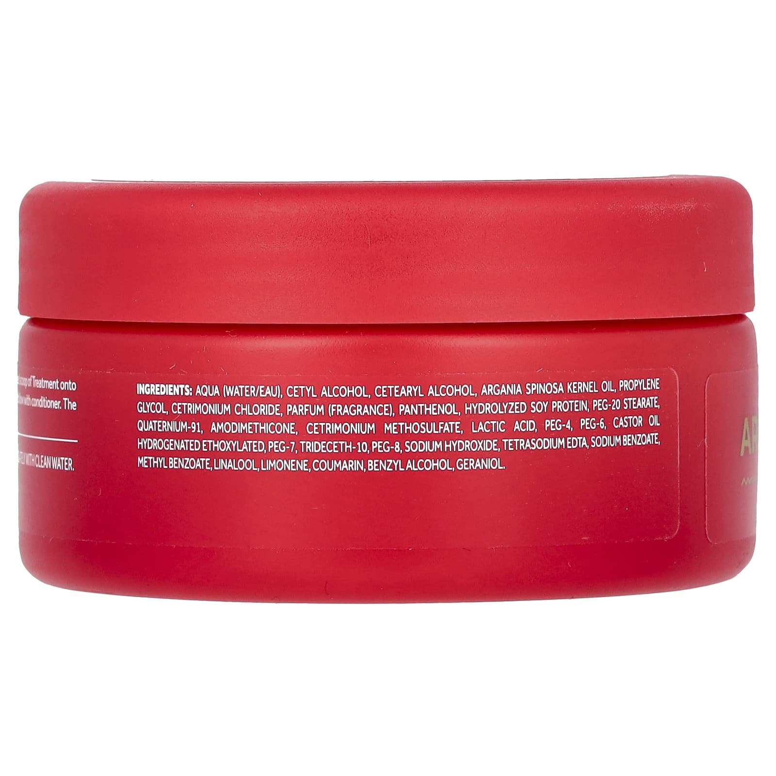 Вода (eau), цетиловый спирт, цетеариловый спирт, аргановое масло (Argania spinosa), пропиленгликоль, цетримония хлорид, парфюмерная композиция (отдушка), пантенол, гидролизованный белок из сои, ПЭГ-20 стеарат, кватерниум-91, амодиметикон, цетримония метосульфат, молочная кислота, ПЭГ-4, ПЭГ-6, касторовое масло, гидрогенизированное, этоксилированное, ПЭГ-7, тридецет-10, ПЭГ-8, гидроксид натрия, тетранатрия ЭДТК, бензоат натрия, метилбензоат, линалоол, лимонена, кумарин, бензиловый спирт, гераниол.