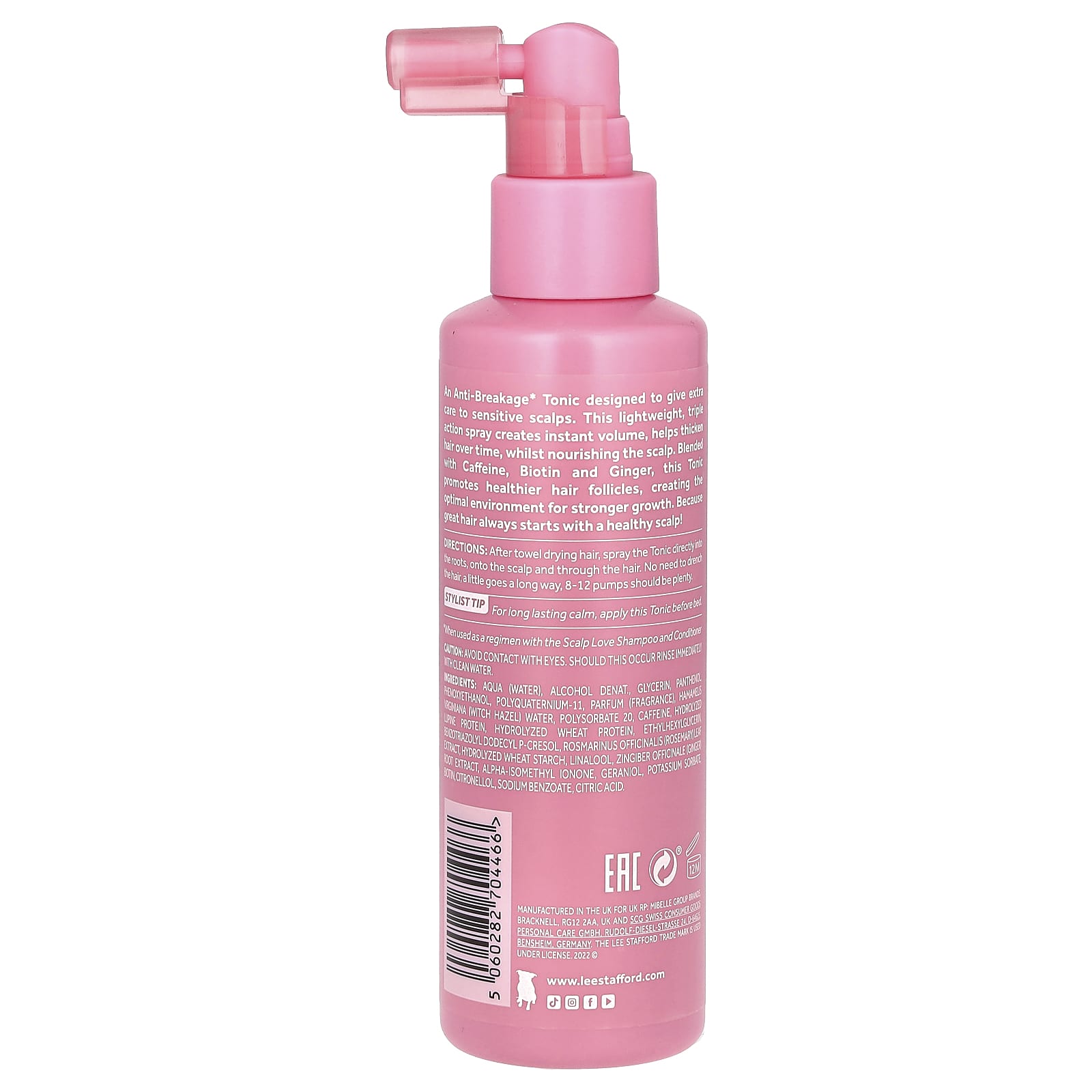 Вода, денатурированный спирт, глицерин, пантенол феноксиэтанол, поликватерниум-11, парфюмерная композиция (отдушка), вода из гамамелиса (Hamamelis virginiana), полисорбат 20, кофеин, гидролизованный) белок люпина (Lupinus perennis), гидролизованный протеин из пшеницы, этилгексилглицерин, бензотриазолил додецил п-крезол, экстракт розмарина (Rosmarinus officinalis), гидролизованный пшеничный крахмал, линалоол, экстракт корня имбиря (Zingiber officinale), альфа-изометилионон, гераниола, сорбат калия и биотин, цитронеллола, бензоат натрия, лимонная кислота.