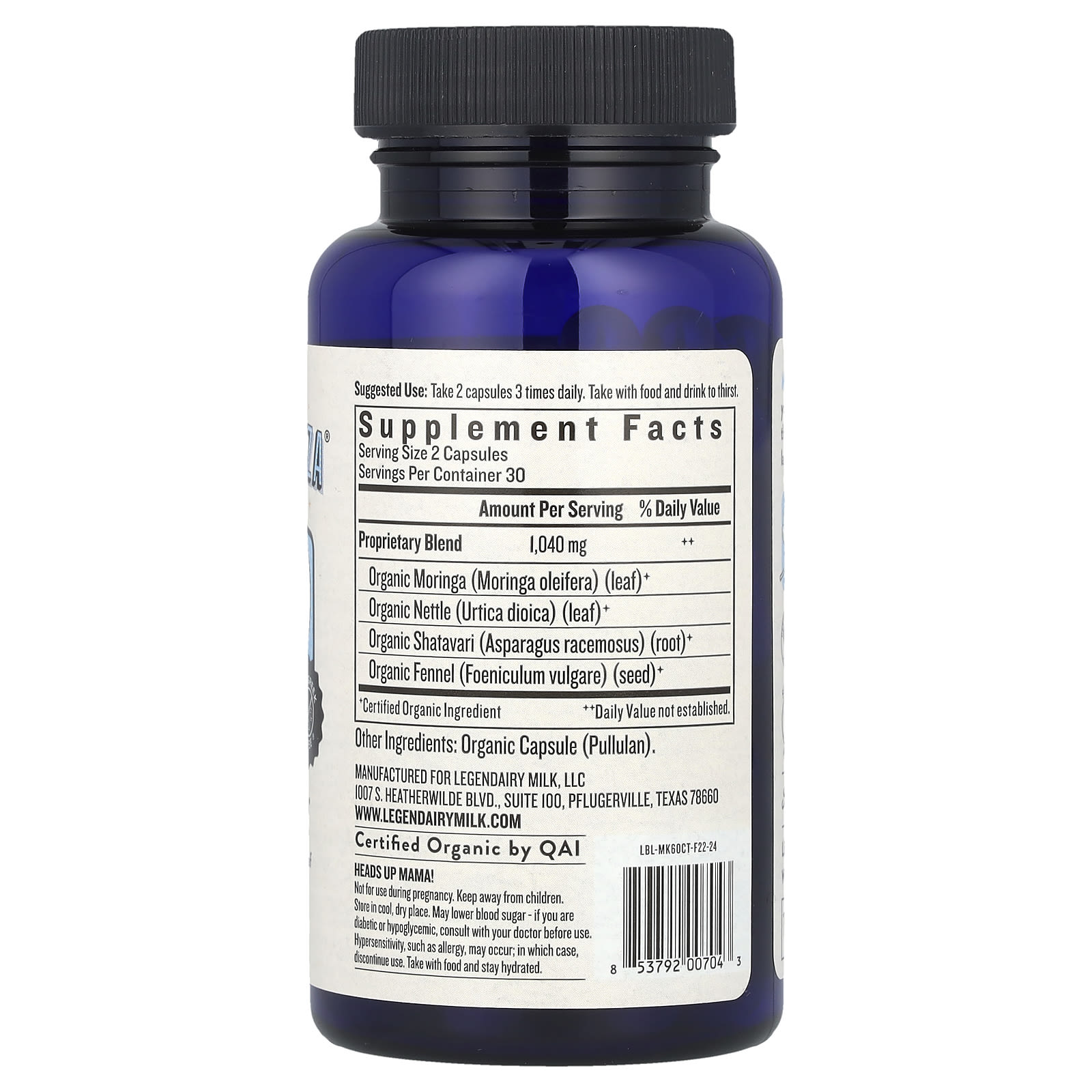 | Запатентованная смесь Листья органической моринги (Moringa Oleifera) * Листья органической крапивы (Urtica dioica) * Органический корень шатавари (Asparagus racemosus) * Семена органического фенхеля (Foeniculum vulgare) * | 1040 мг | ** |