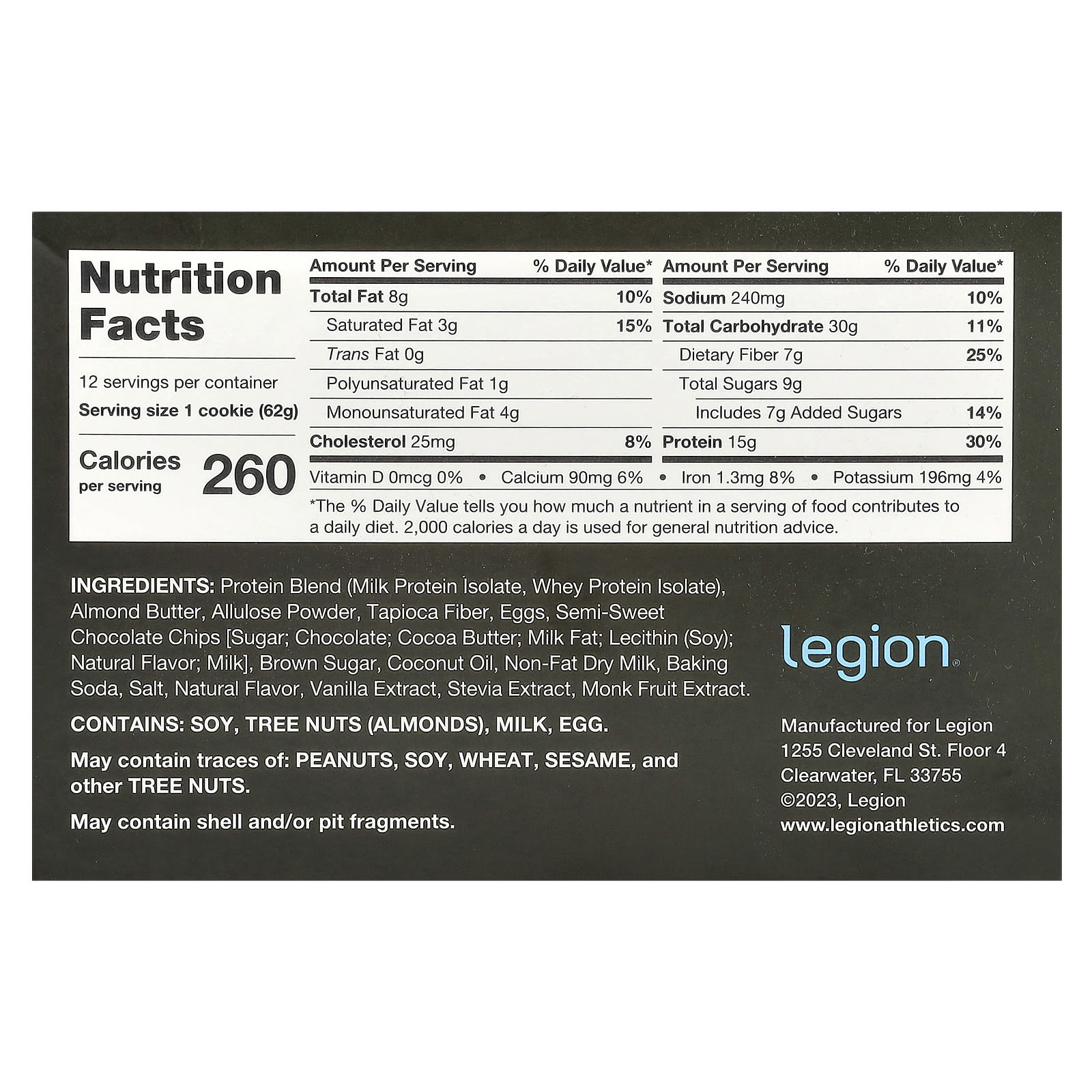 Смесь белков (изолят молочного протеина, изолят сывороточного протеина), миндальное масло, аллюлозный порошок, тапиоковая клетчатка, яйца, кусочки полусладкого шоколада [сахар; шоколад; масло какао; молочный жир; лецитин (соя); натуральный ароматизатор; молоко], коричневый сахар, кокосовое масло, обезжиренное сухое молоко, пищевая сода, соль, натуральный ароматизатор, экстракт ванили, экстракт стевии, экстракт архата.